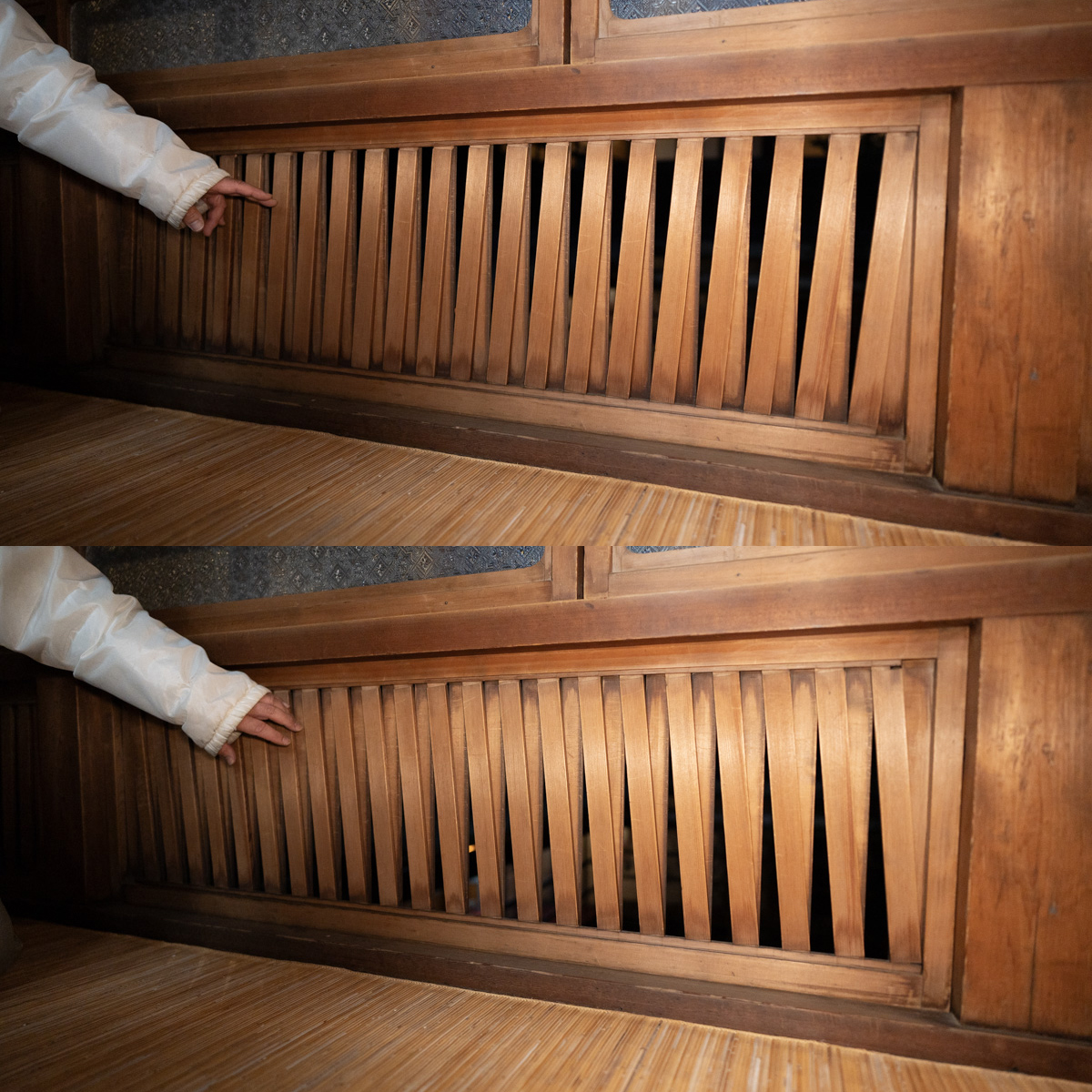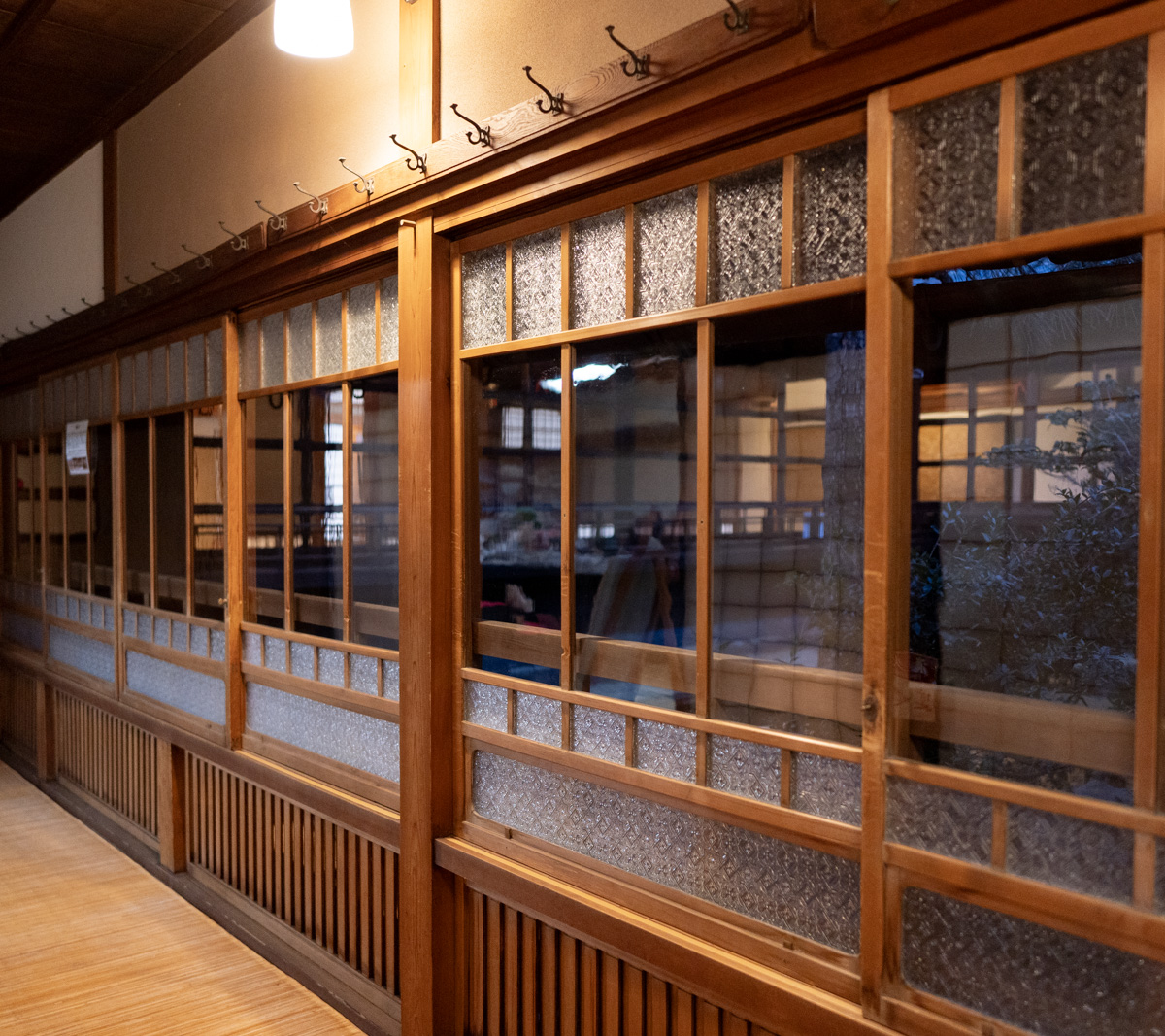 ▼「翁の間」正面の廊下には無双窓が仕込まれている。通常の無双窓はただ開閉できるだけだが、この無双窓は通常の開閉に加え、斜めにも開くことができるスペシャル仕様。案内して下さった奥野雅則会長に実演して頂いた。令和でもヌルヌル動く。