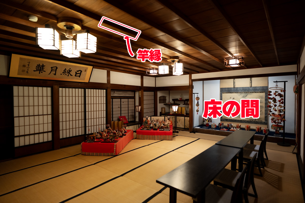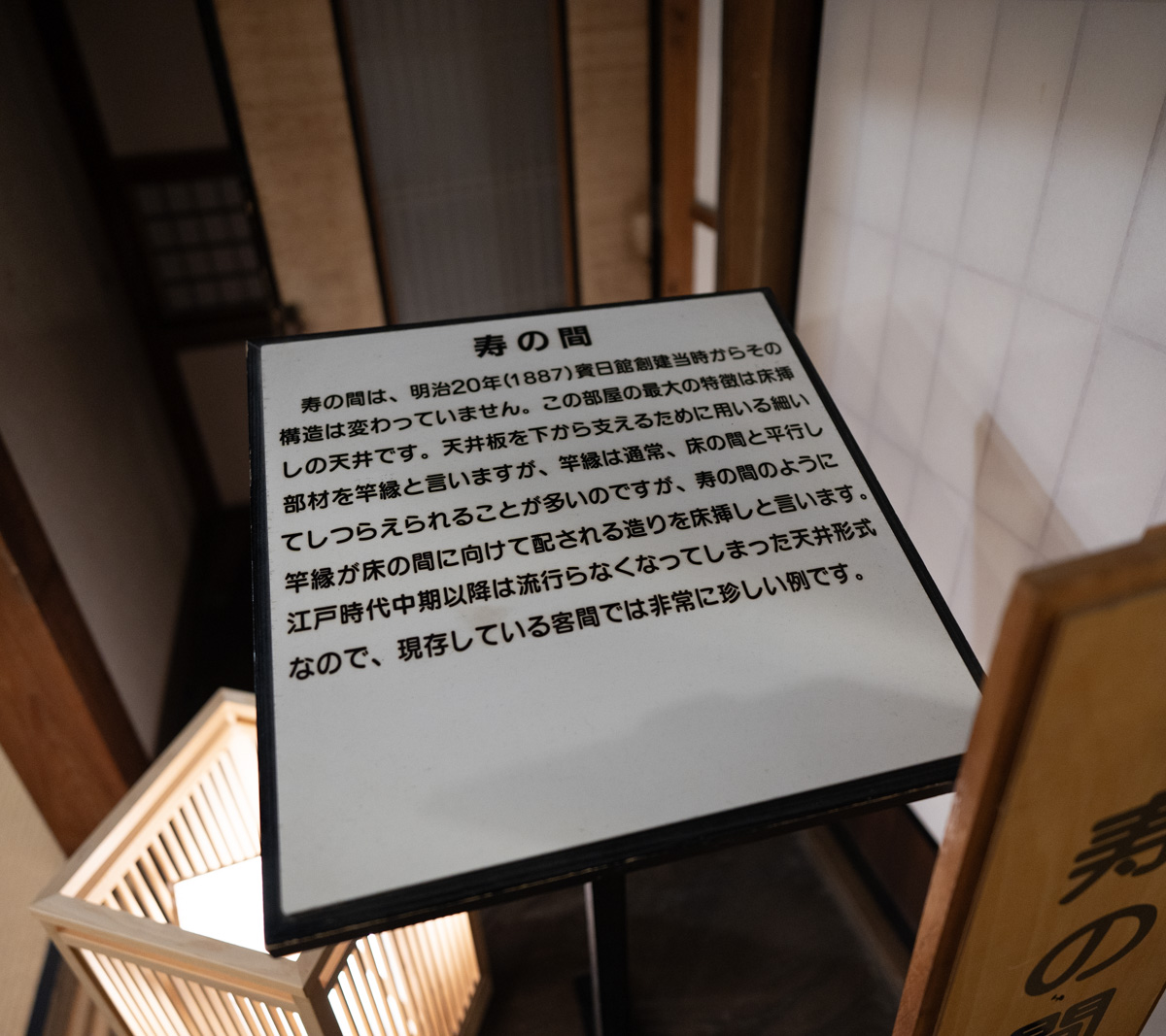興味深いのは、解説プレートにもある天井の構造。竿縁の配置が床の間に対し垂直になる床挿しというスタイルなのだ。なお畳は寺みたいな敷き方だが、床の間の前には横向きに配置して床挿しにはなっていない。