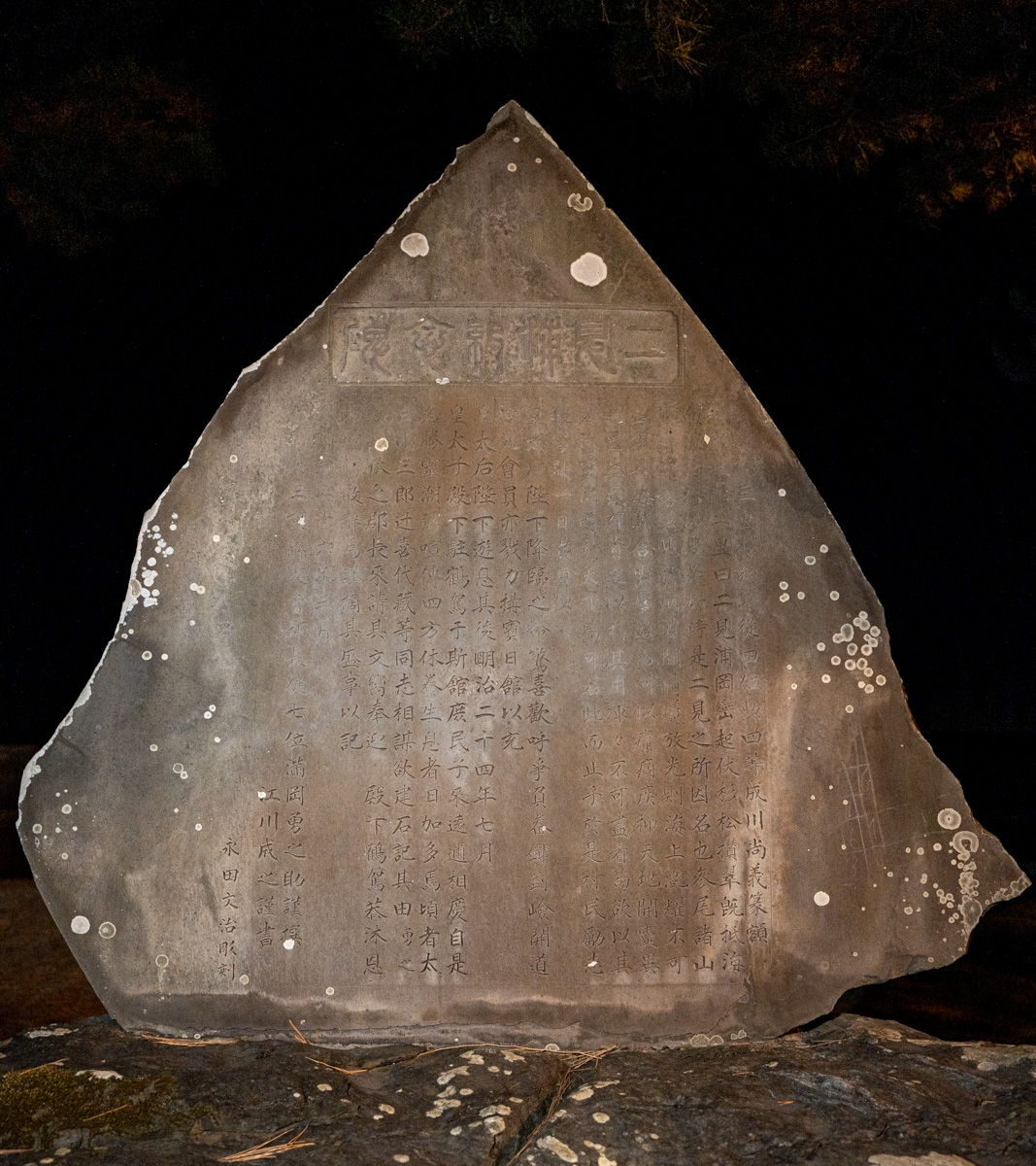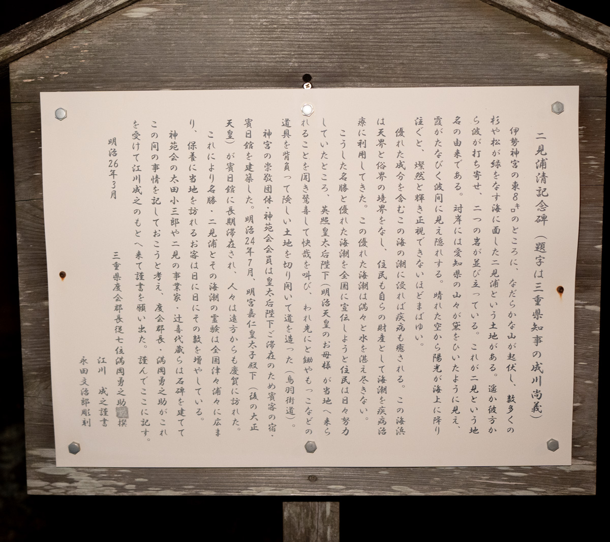 ▼二見浦記念碑。英照皇太后の来訪に歓喜した当時の地域住民らによって、鳥羽街道(京都のあれではない。三重の鳥羽街道)が整備されたことが分かる。賓日館ができて以降の発展もふまえると、皇太后が来なければ、二見周辺や神社は現在のようになっていなかったかもしれない。