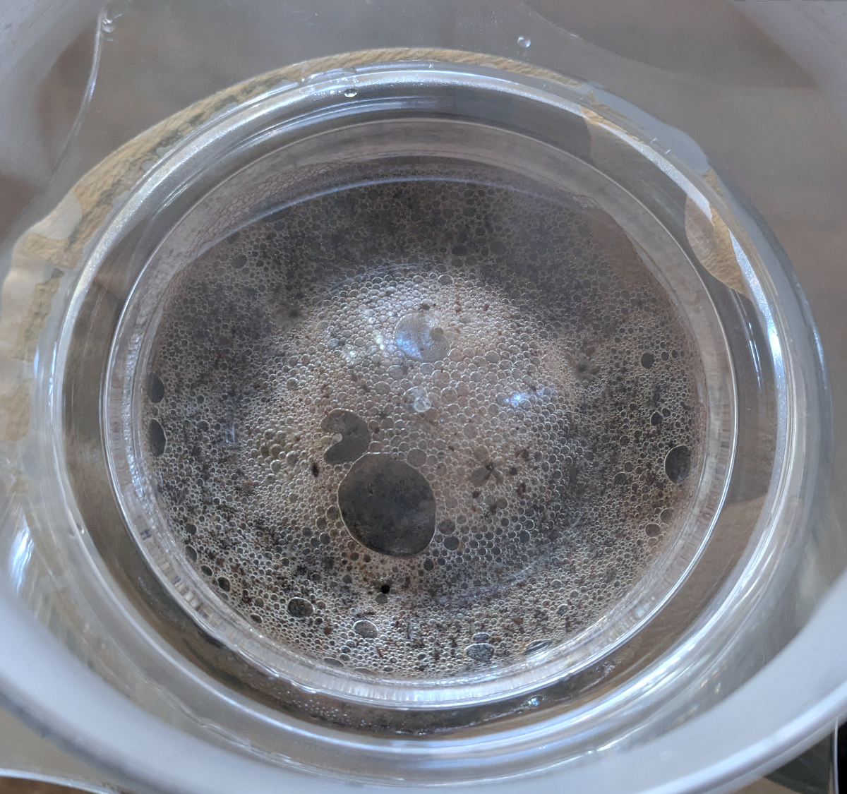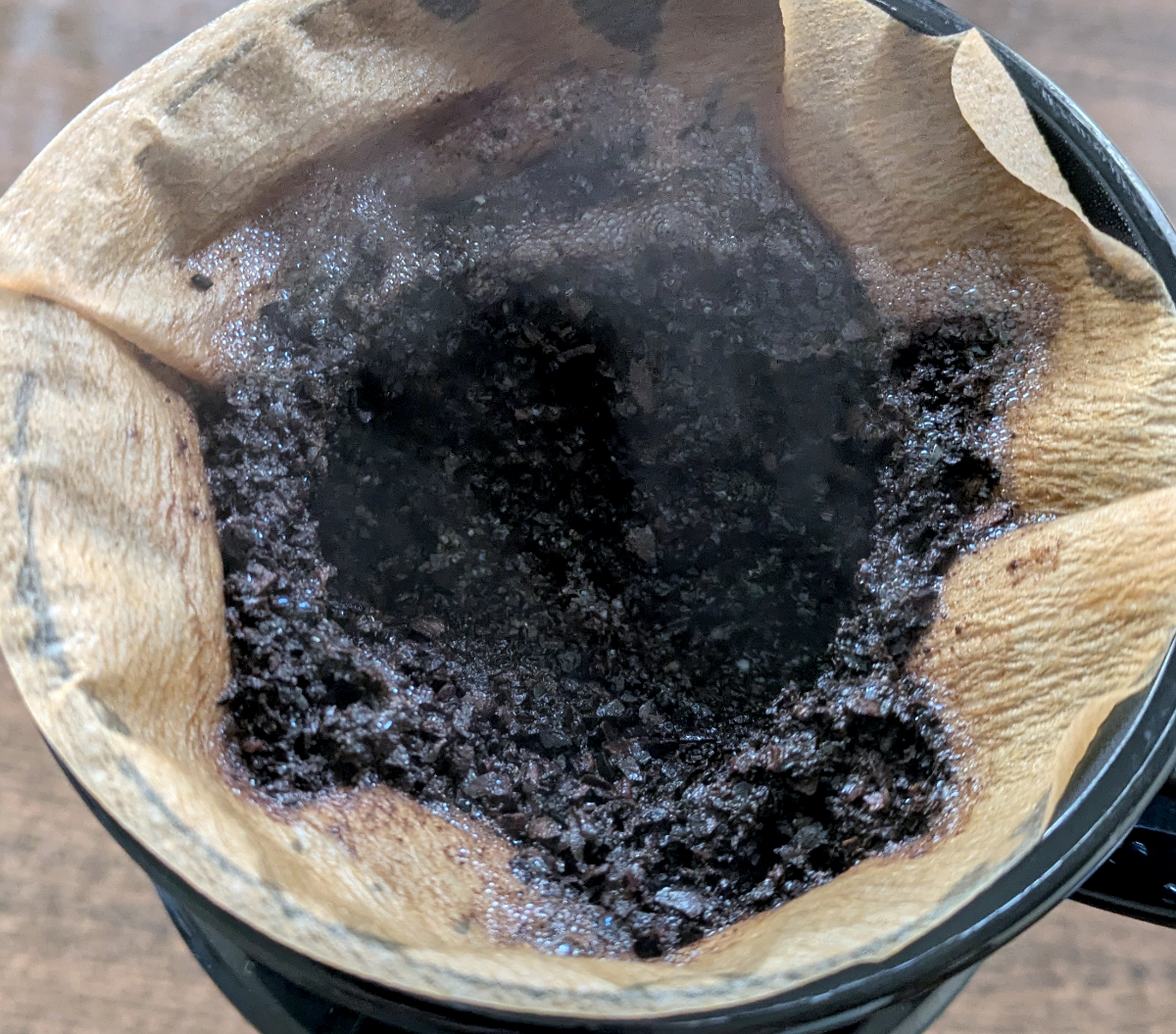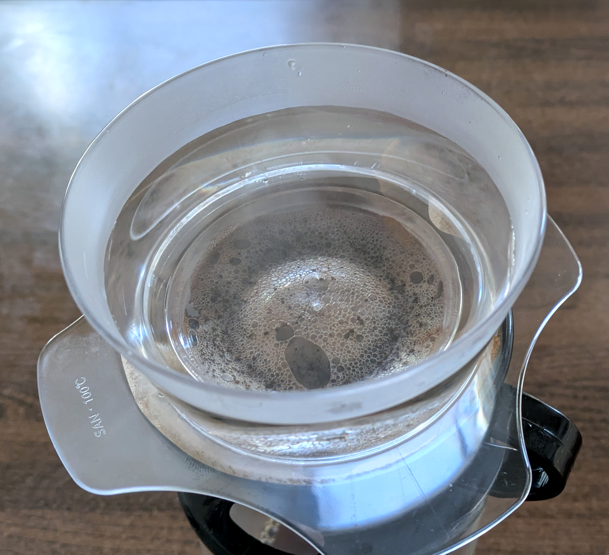 落ち切ったところで、シャワードリップを外してみると、豆にまんべんなくお湯がいきわたったことがわかる。おそらく端までお湯はいってるはず。