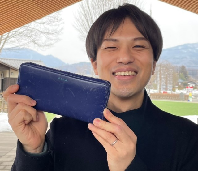 本人コメント「何年前に買ったか忘れたけど、ポールスミスのもの。前も財布がパンパンなのがダメって言われた気がする」