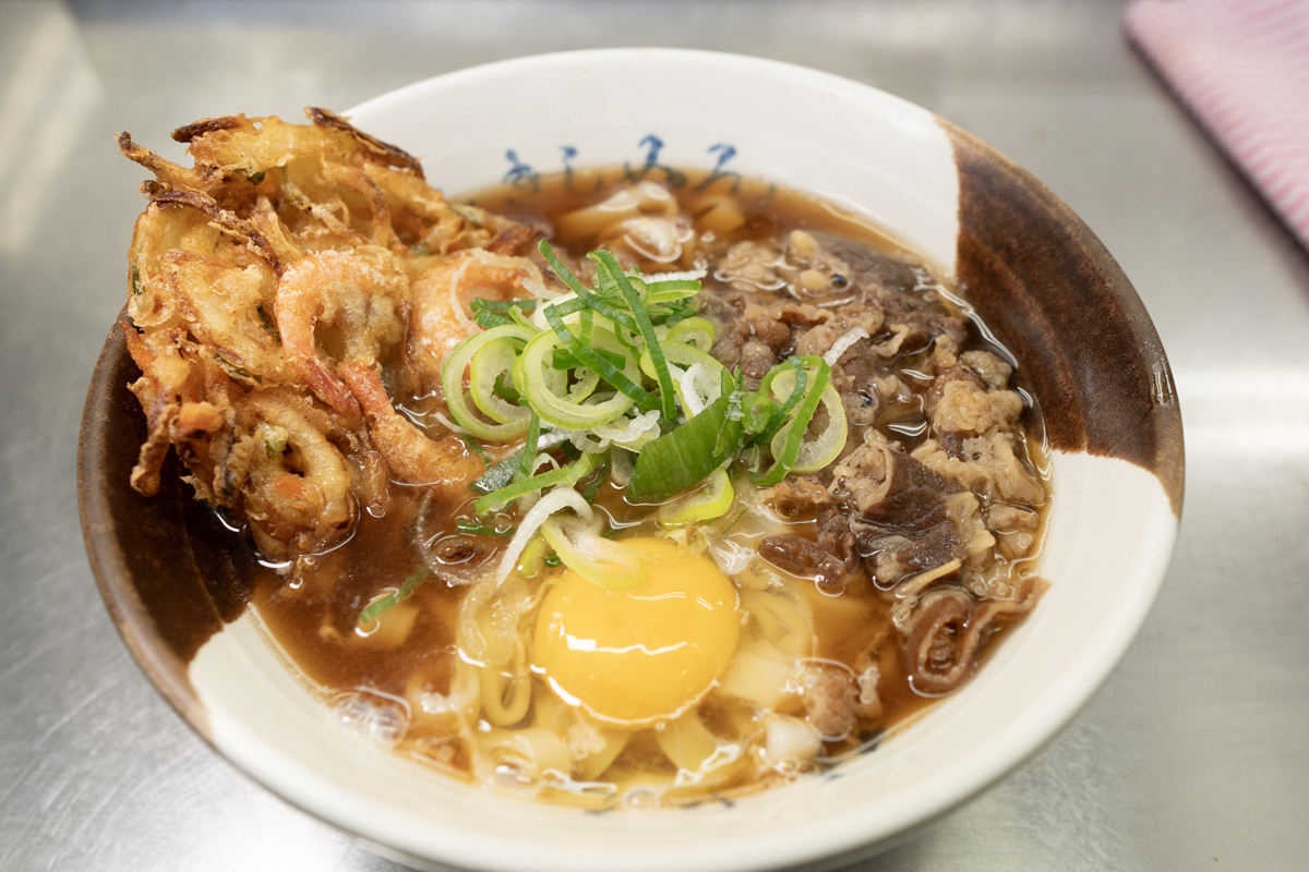 オーダーしたのは「牛肉(玉子)きしめん」に、トッピングのかきあげ。揚げたての店舗だからな。天ぷらを頼まない手は無い。