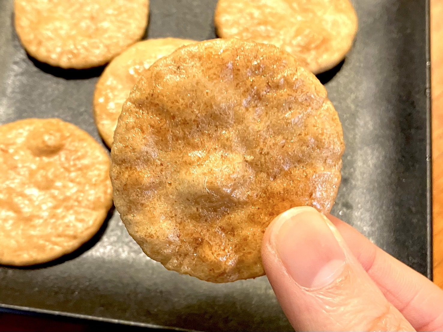 お土産用のものとは違って、こちらはThe・おせんべいといった感じのビジュアル。固形のえびは入っておらず、粉末状にして生地に練り込んであるそうだ。