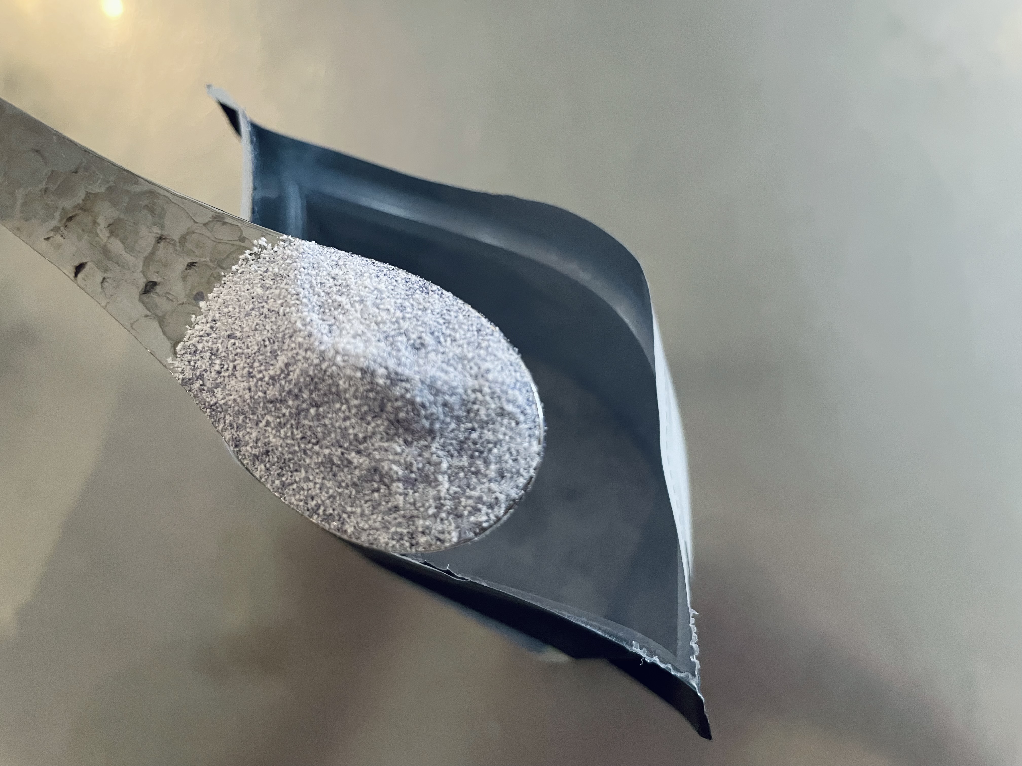 「ブルーラテ」は粉末タイプで、パッケージを開けるとサラサラとした青白い粉が登場。