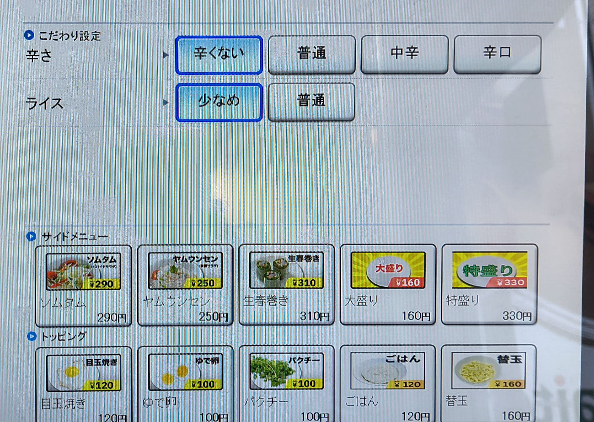 さっそくグリーンカレーのボタンを押すと、続いて辛さとライスの量を選ぶことができる。