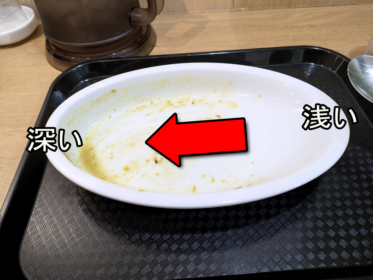 余談だが、カレーの器にもひと工夫が隠されている。食べ終えた器をお見せして恐縮だが、片側に向かって傾斜がついているののだ。スプーンで全部キレイにすくえるので、この器はすべてのカレーのお店に導入すべきじゃないかな。