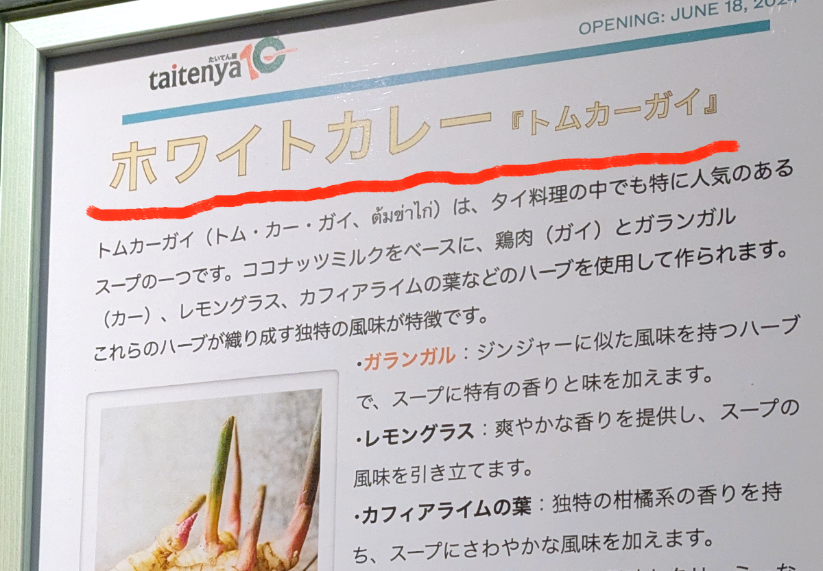 私のような疑問を抱く人が来ることを想定して、ホワイトカレーの説明が貼り出されている。それによると、ホワイトカレーとは「トムカーガイ」のことだった。