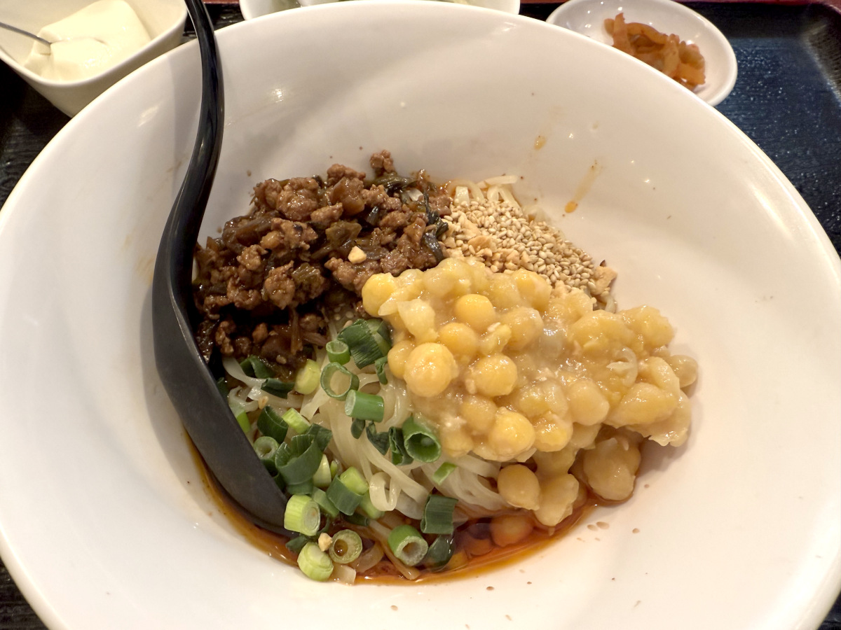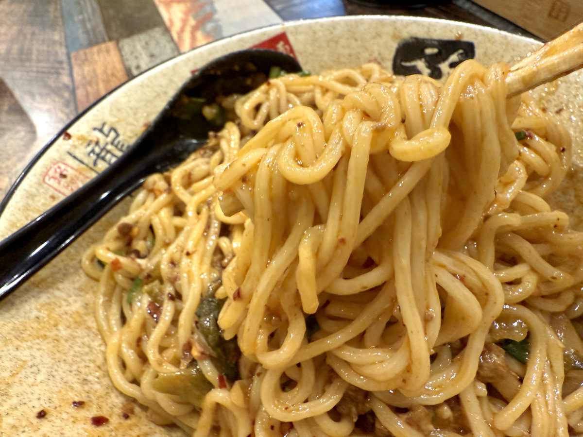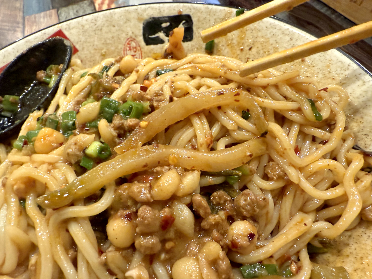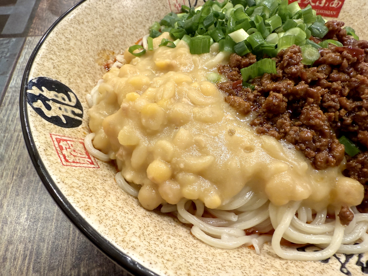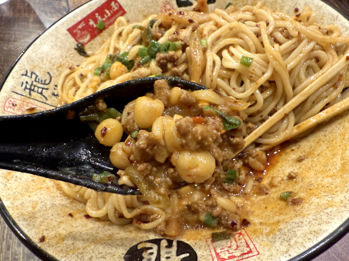 そこで以前とは別の店で『碗雑麺』を食べてみることに。推測の域を出ないが、乱暴に言えばビリビリ系のまぜそばにえんどう豆さえ入っていれば『碗雑麺』は成立するのではないだろうか?