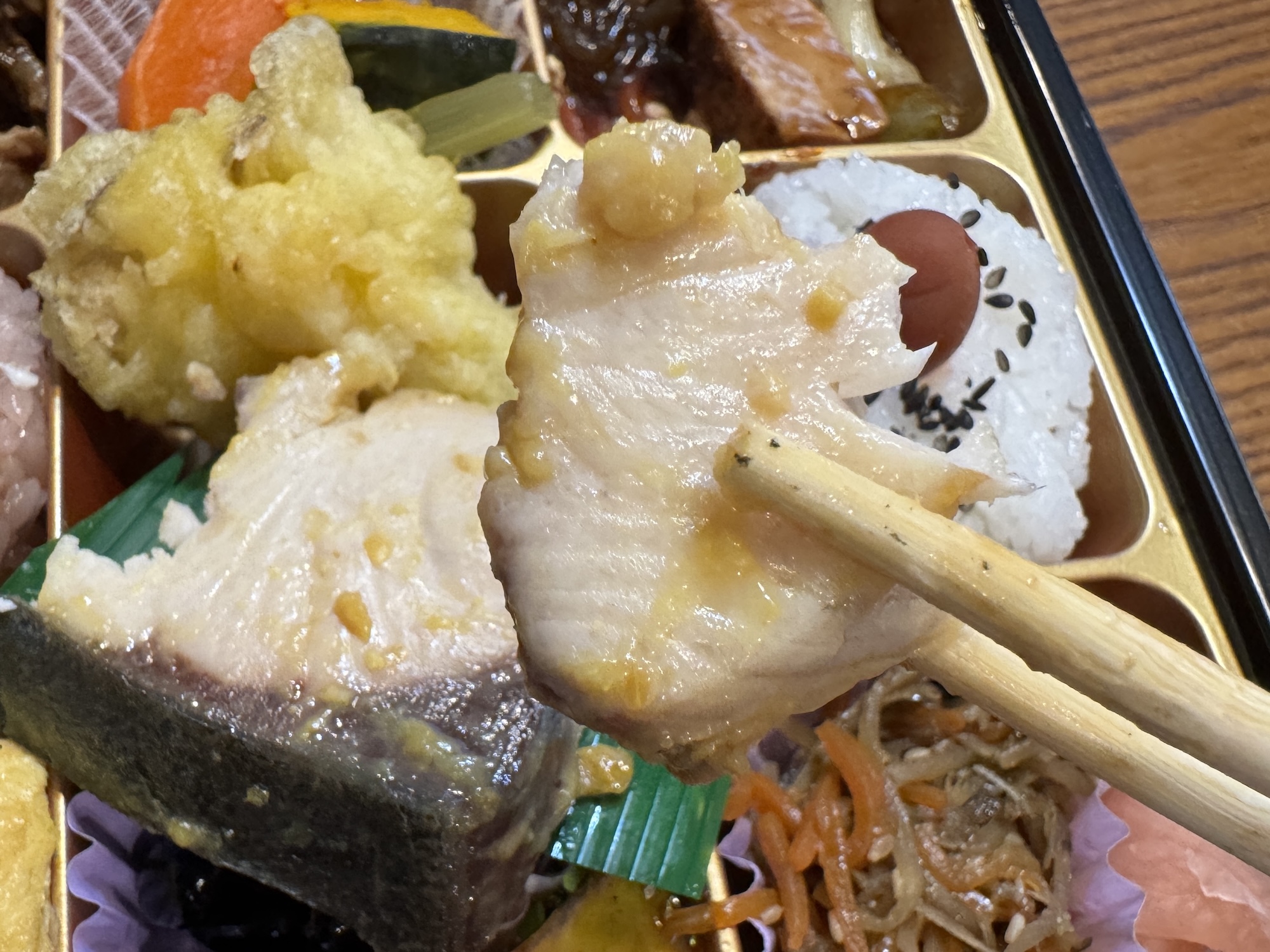 日本人は「いろんなものをちょっとずつ食う」のが大好きな民族である。今回の一件で私の幕の内弁当に対する意識は180度変わった。ヨソの幕の内弁当がどうかは経験不足のため不明だが、少なくともサミットの「彩り幕の内御膳(活〆ぶり西京焼入)」はわざわざ土日に出かける価値がある。最優秀賞はダテじゃないっ!