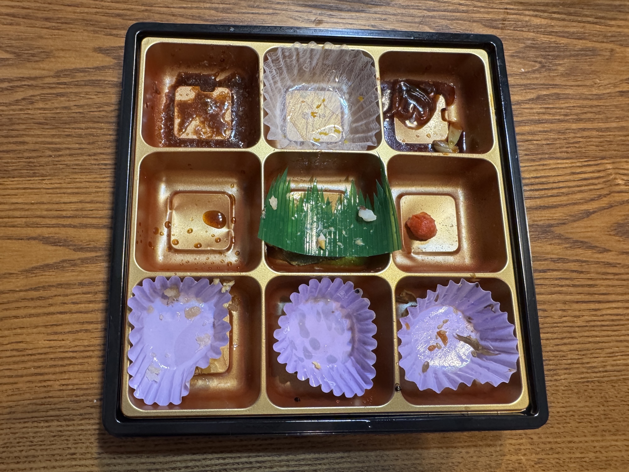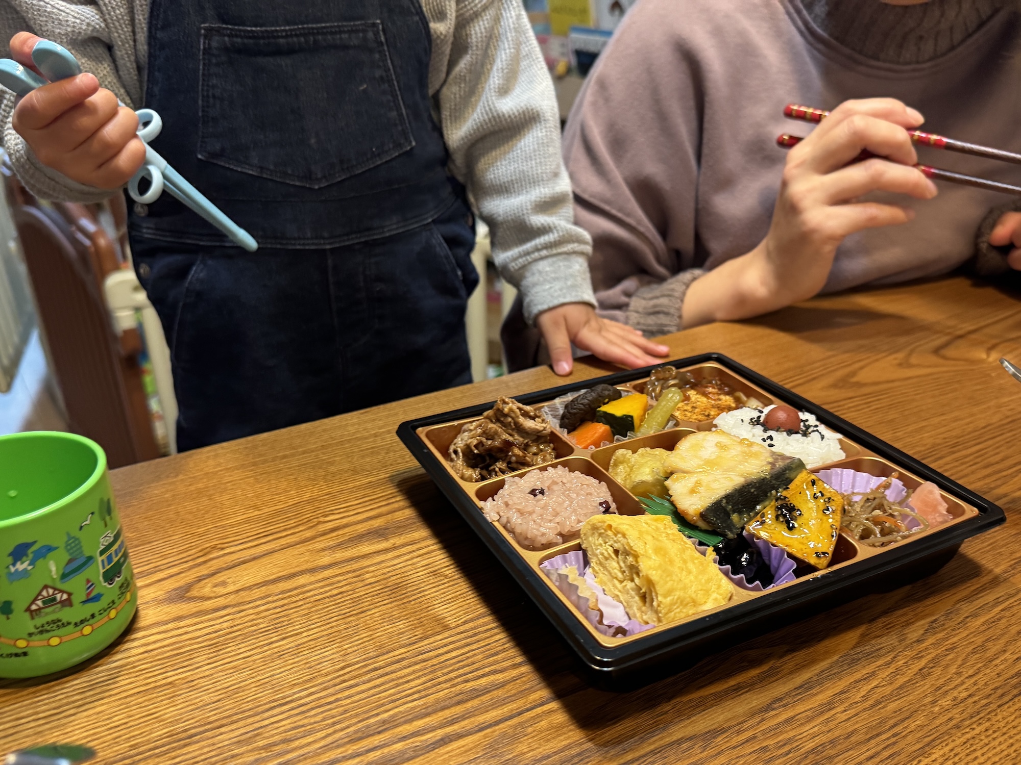 9つの部屋に分かれた弁当箱に詰められたおかず(白米と赤飯含む)は全10品。私が最も感心したのは、スキヤキ風の煮物が “肉” と “それ以外” に分けられている点だ。こうすることで豆腐やネギはおかずとして、肉は白米に乗っけて牛丼風に味わうことができる。