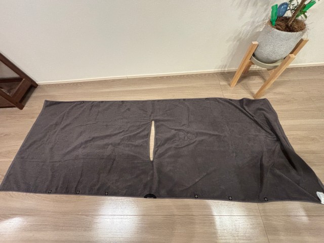 ただ、家の風呂上がりよりは海とかアウトドアのサウナで着るのが良さげな感じかな……。水風呂から上がったあとにととのいタイムに着てたら気持ちよさそう。あとは、子育て中の方の子供の風呂上がりで忙しいときなんかは便利だと思う。