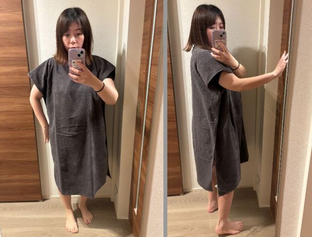 これをバスタオルとして使って体を拭いたあと、スナップボタンをとめてそのまま頭から被って着られる。家での収納と洗濯物が増えない点でいえばこっちに軍配があがる。ただし、袖がないので、長時間着たままだとちょっと寒いと思う。