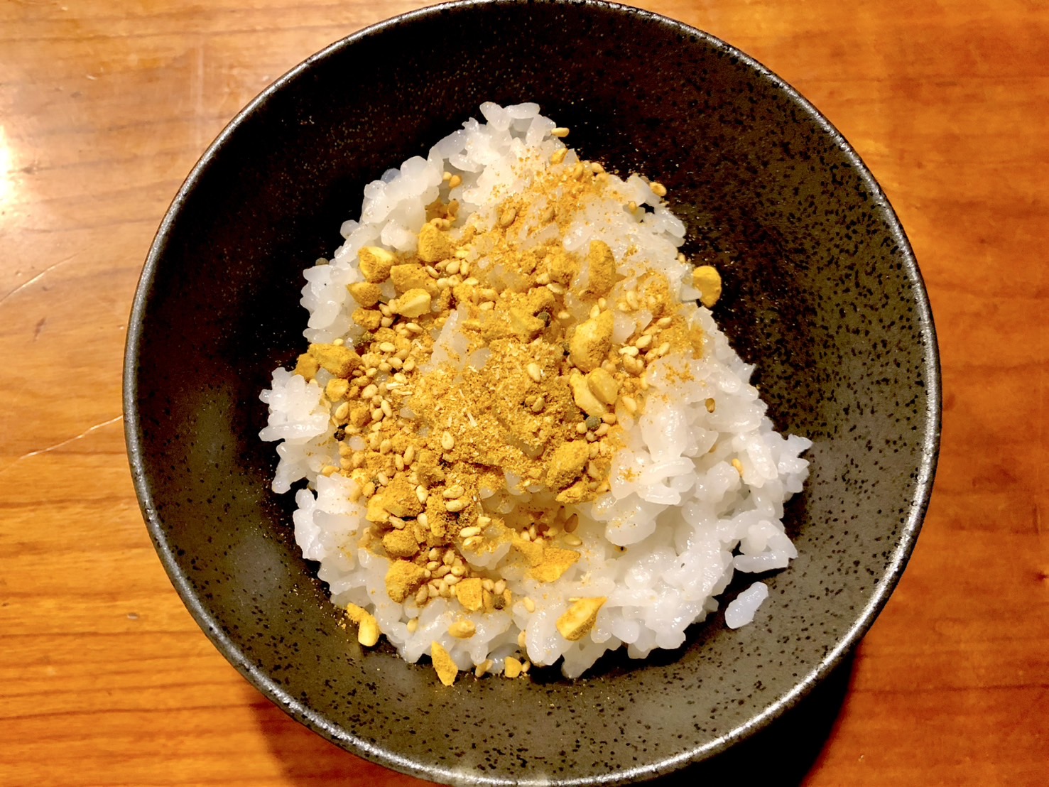 ドキドキしながらも、さっそく白米の上にかけてみた。所々にある大きめの粒がナッツ類だろう。思ってたよりいっぱい入ってる。