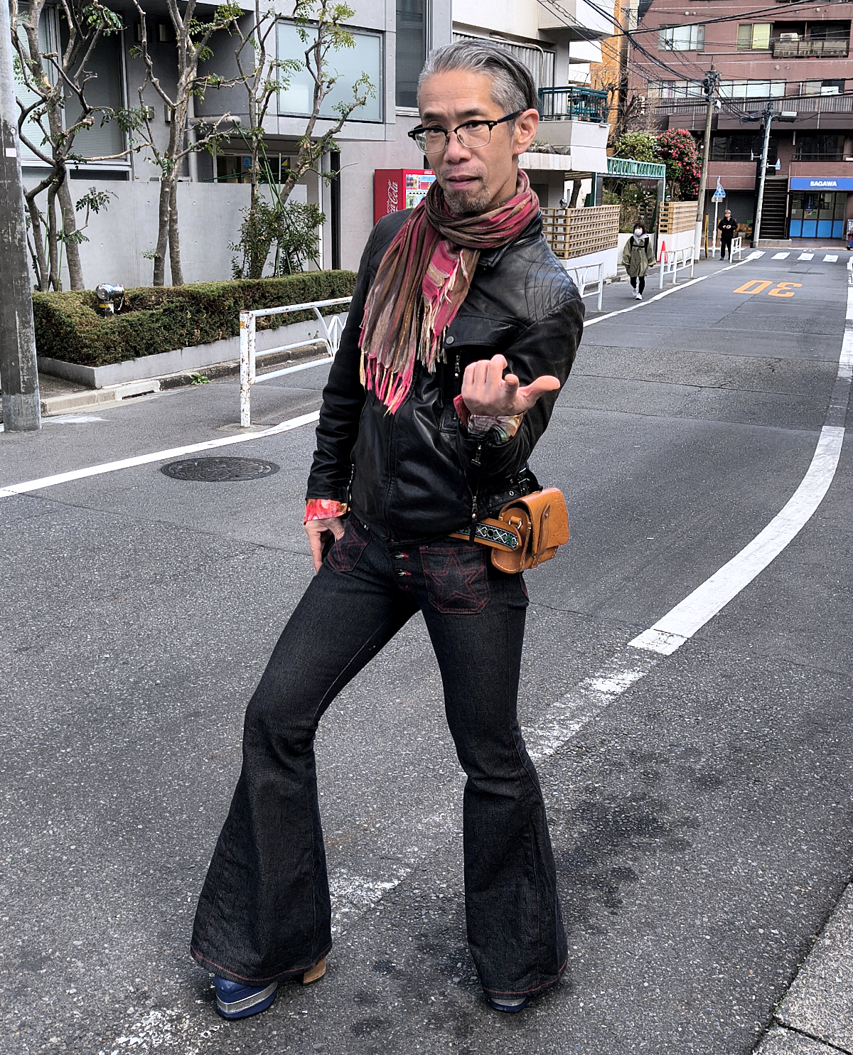 その集大成とも言える姿が、革ジャンにベルボトム、ロンドンブーツという着こなしだ。