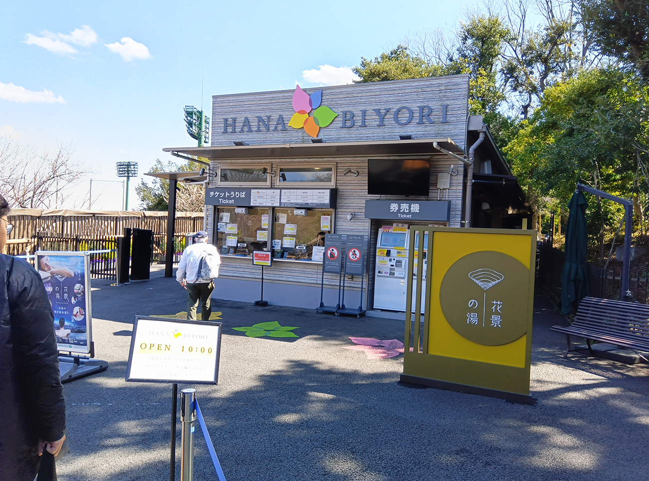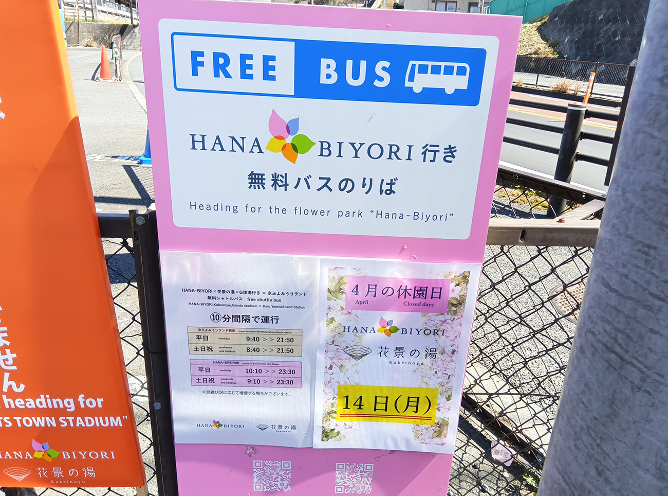 『花景の湯』は、よみうりランド隣のフラワーパーク『HANA・BIYORI』の中にある。駅前からよみうりランド行きの無料バスが出ていて、それに乗ったら1分くらいで到着した。ちなみに、無料バスは10分間隔で運行している。