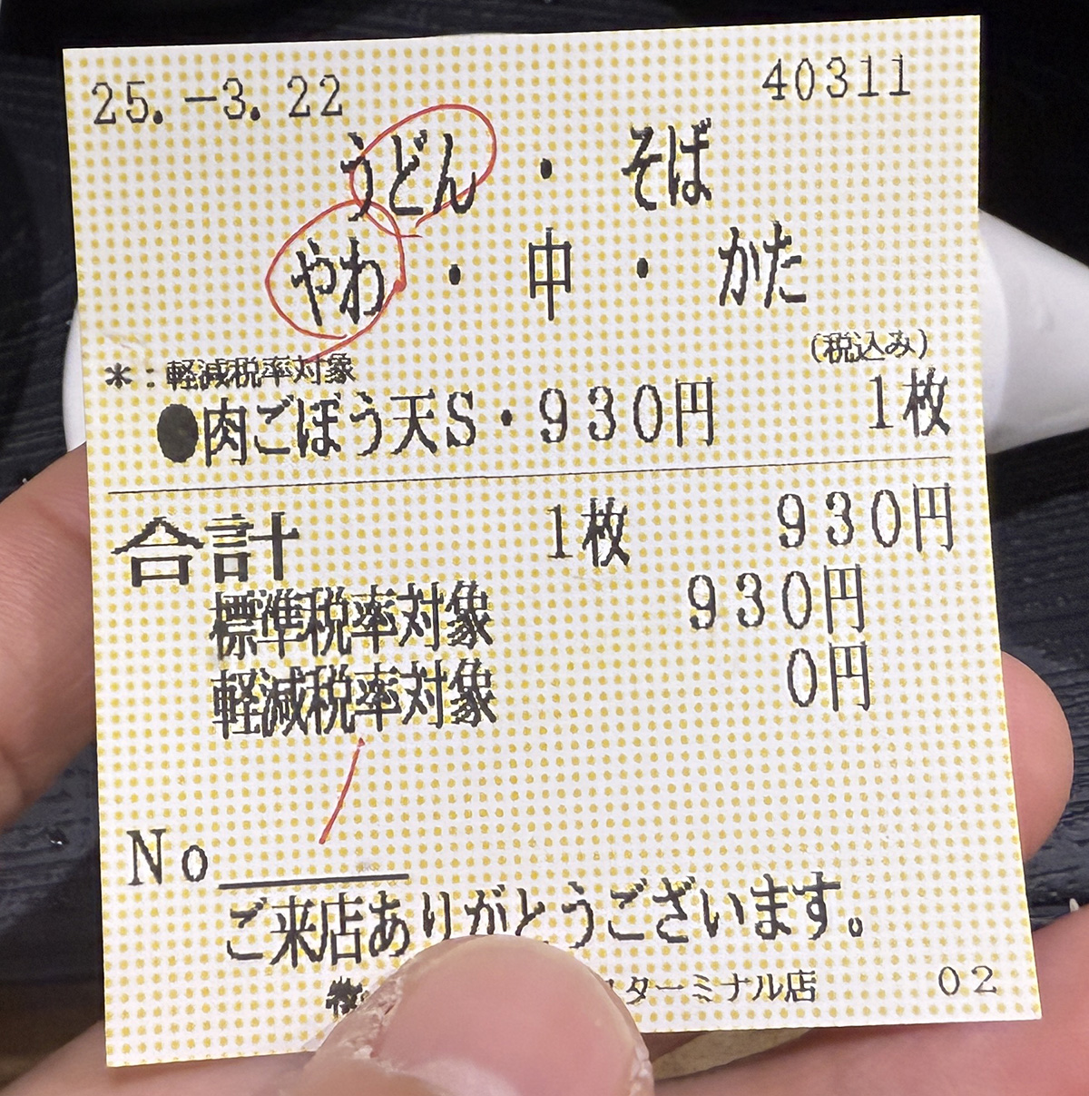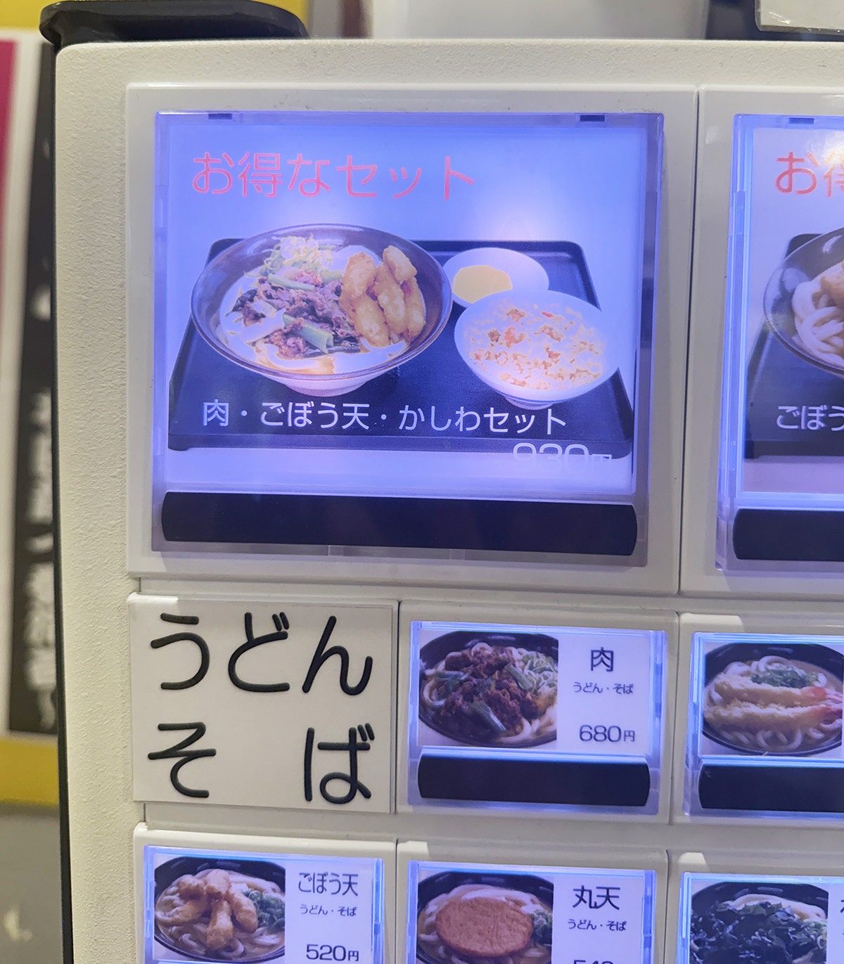 食券機の左上には「肉・ごぼう天・かしわセット(930円)」が鎮座していた。食券機の左上といえば、大抵の場合「最もポピュラーな品」だと思われる。