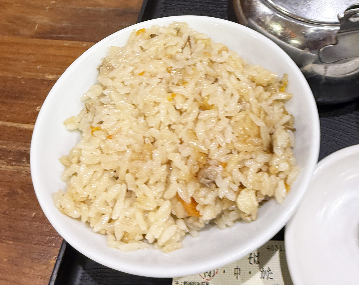 かしわごはんも実においしい。このうどんなら、白米ではなく、かしわごはんが最適であろう。なるほどなぁ。よく考えられている。
