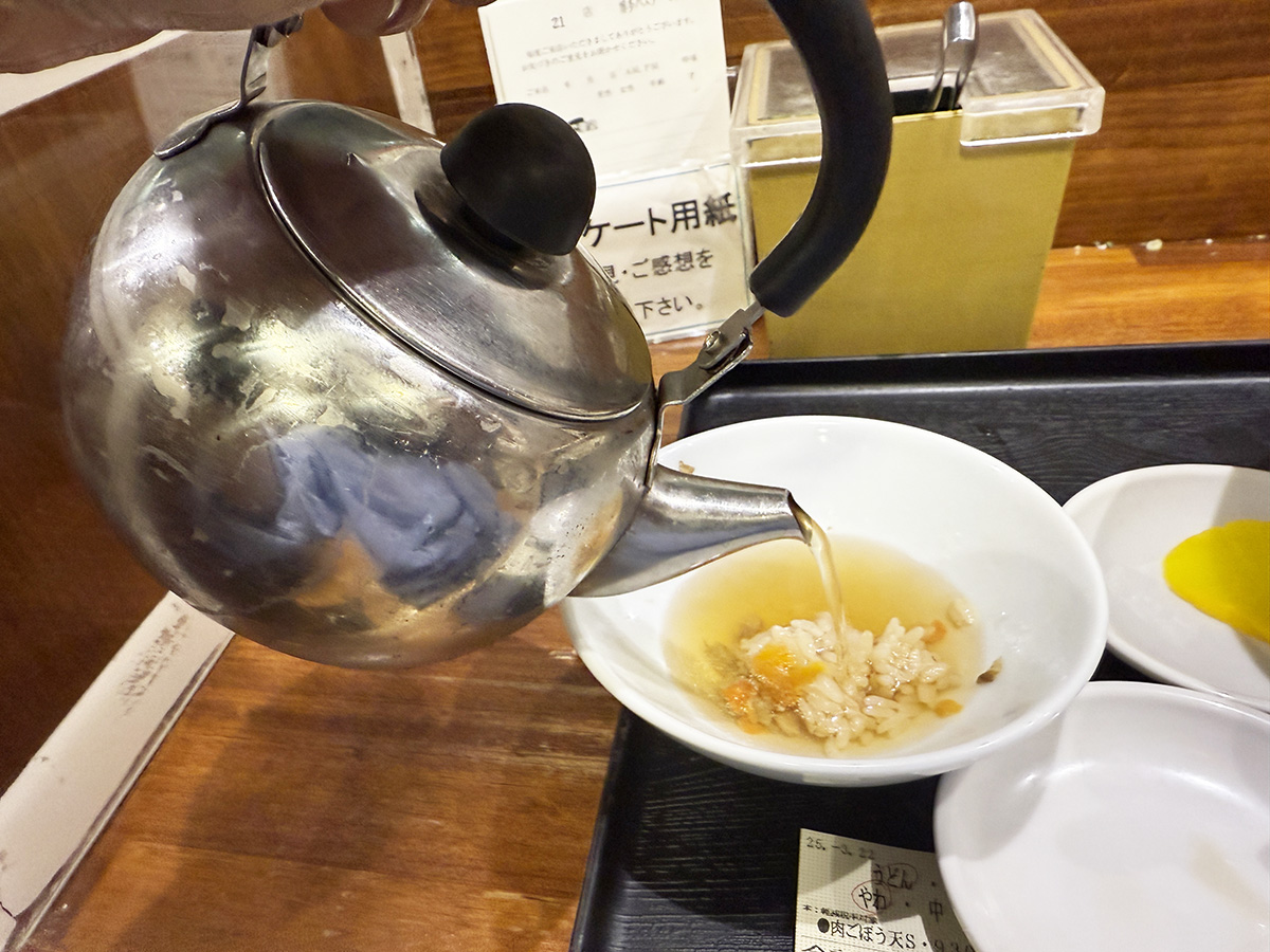 すぐさま店員さんに聞いてみると、「継ぎ足し用のつゆ」であるとのこと。なんでも、うどんがみるみる汁を吸ってしまうので、別途つゆを用意してくれているらしい。