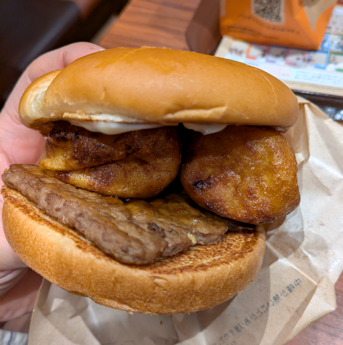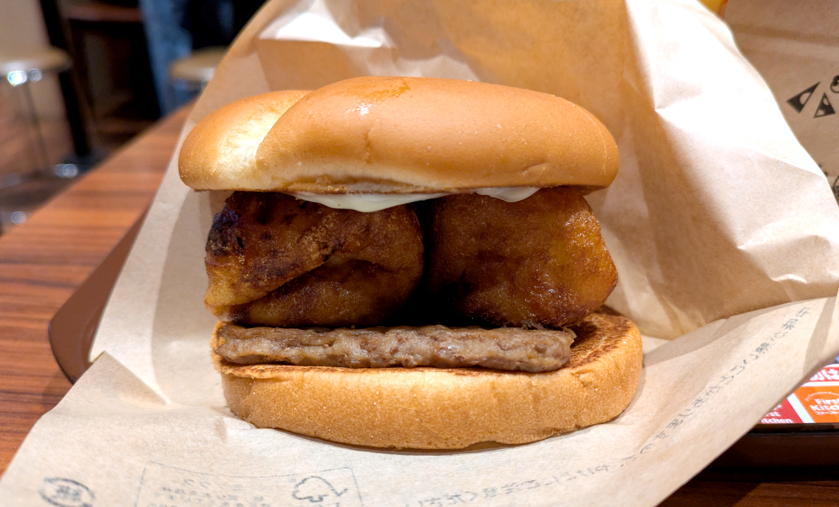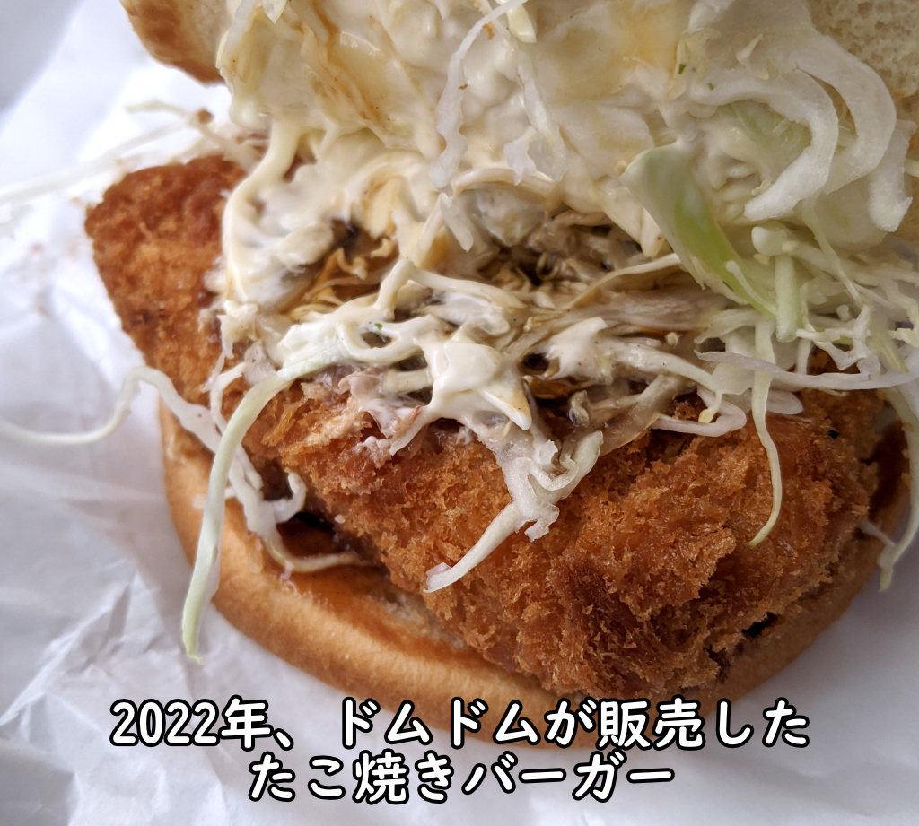 ▼2022年にドムドムが販売した「たこ焼きバーガー」は、たこカツもしくはたこ揚げバーガーだった。アレはたこ焼きではなかった……