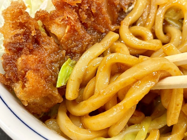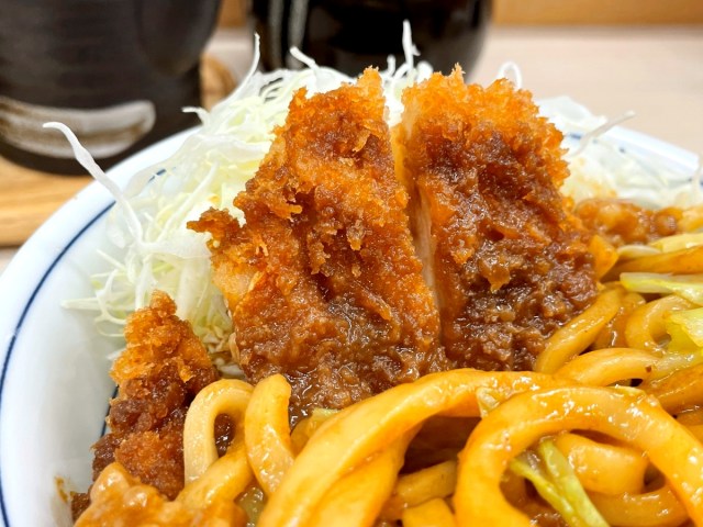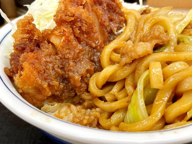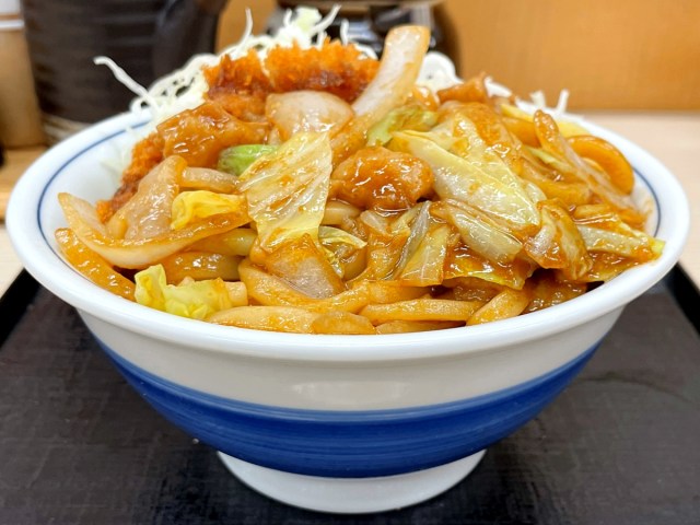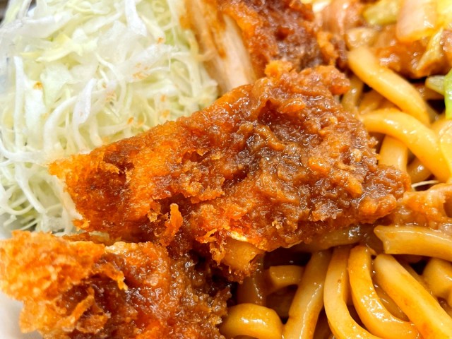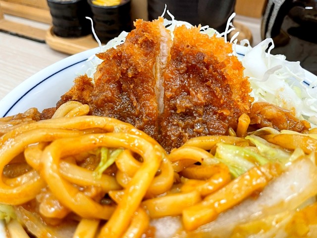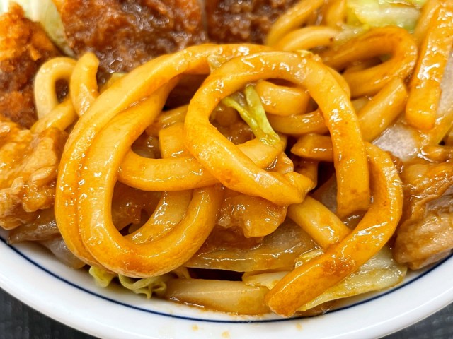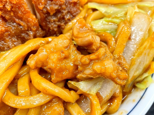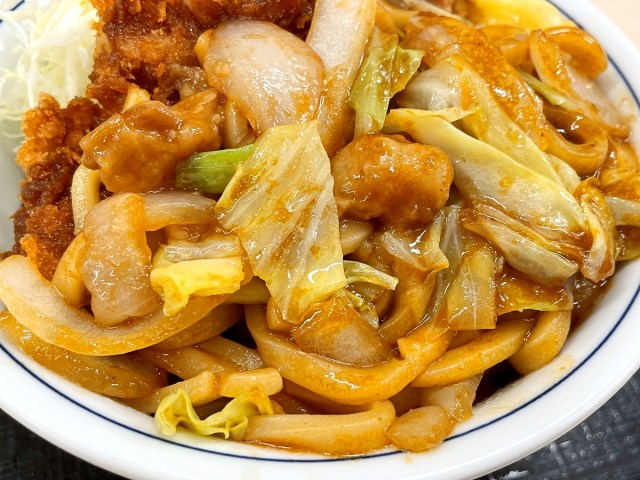とにかく目を引くのが、器の半分以上を占拠している焼きうどんだ。ここでまず脳が軽くバグる。本当にうどんなのか? これはカツ丼ではなかったか? 判断がつかないため、今度はじっくり観察してみると……