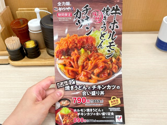 それでは改めてご紹介しよう。このカオスの名は『ホルモン焼きうどんとチキンカツの合い盛り丼』(税込869円)。『ホルモン焼うどんとチキンカツの合い盛り定食』(税込979円)もあるが、今回はよりカオスな丼の方を選択した。