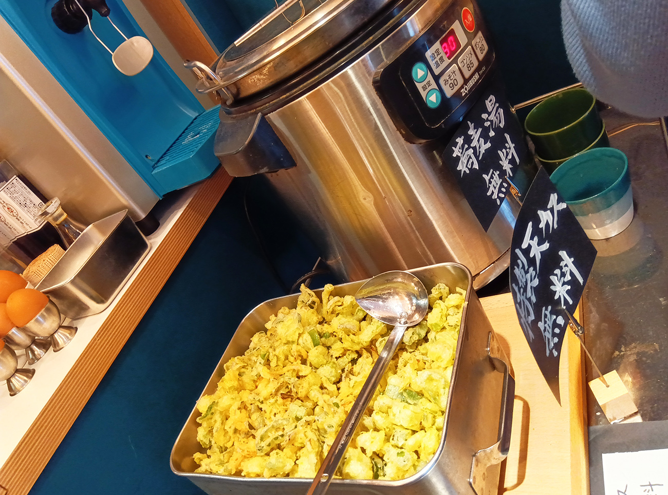 さらには、無料トッピングとして用意されている天カスが全然カスじゃない。天カスに入ってるのは春菊だろうか? むしろ、天カスをこれ用に作ってるレベルの大きさで、トッピング必要ないくらいのトッピング力(りょく)を感じた。