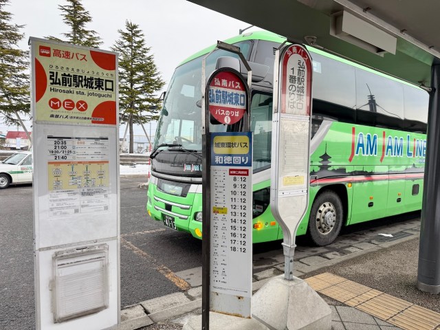 というわけで今回は、仕事後に22時20分発「ジャムジャムライナーJX931便 盛岡・弘前・青森行き」で弘前に行くぞォォオオオオ! 3列独立シートでカーテン付き。夜のうちに移動して翌朝7時40分頃には「弘前駅城東口」に到着するという。最高かよ!