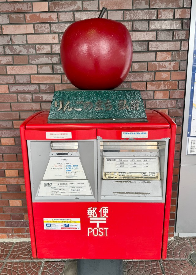 弘前は「りんごの街」らしい。郵便ポストには真っ赤なりんごが乗っていて、男女2人組の銅像のタイトルは「りんごの風」。そういえば、駅構内にもデカいりんごがあった。