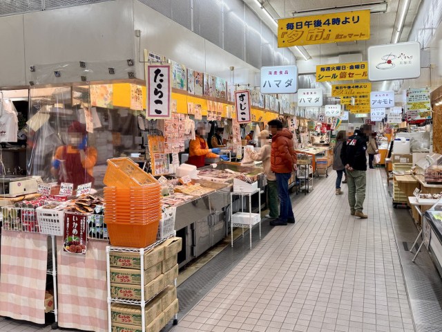 寒い……そのまま向かったのは、8時から営業している「虹のマート」。鮮魚店や惣菜店など、弘前市民の台所として知られる食品市場である。創業は1956年らしい。