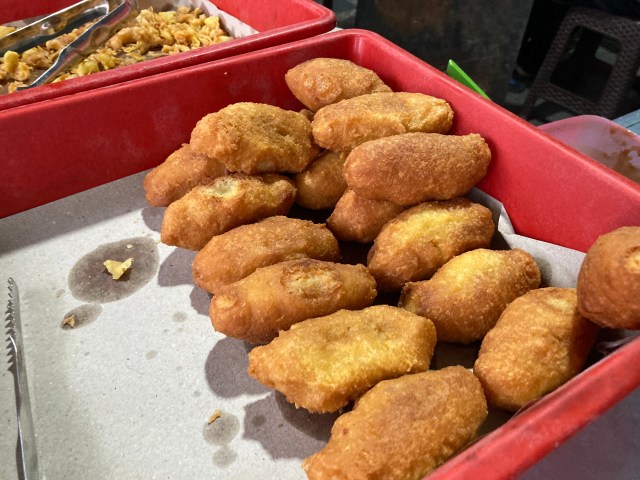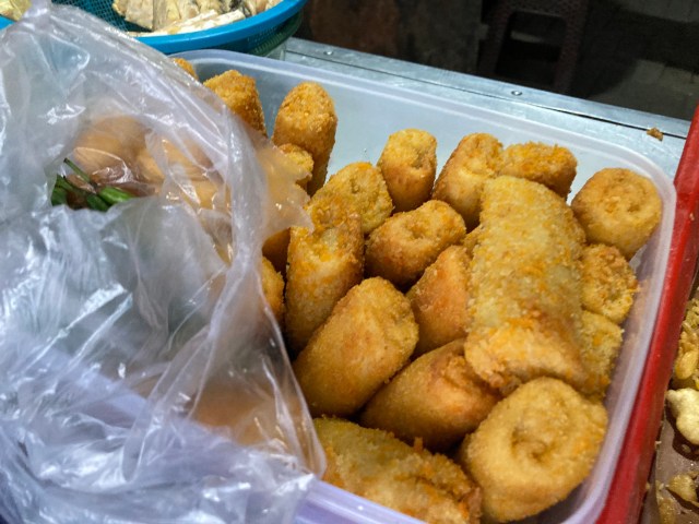 これは「Risol Mayo(リソル・マヨ)」。ソーセージ、卵、ハム(牛の)とマヨネーズを皮で包んで、それをパン粉につけて揚げたもの。こいつはゴレンアンの分類には入らないが、なぜかあったので一応紹介。