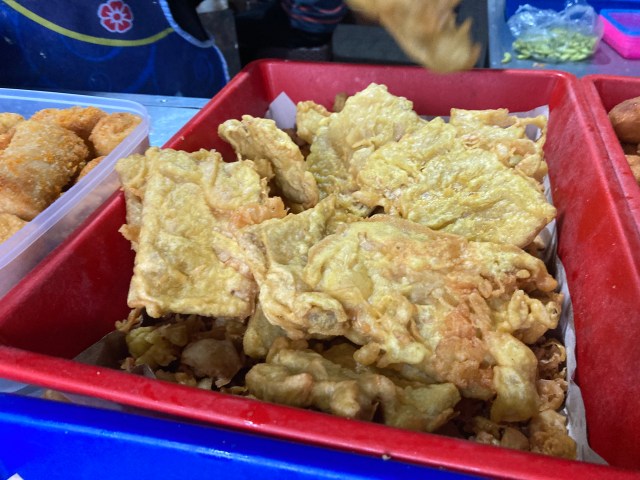 手前にあるのが「Tahu Goreng(タフ・ゴレン)」。中に野菜や麺などが詰め込まれた豆腐を衣につけて揚げたやつ。