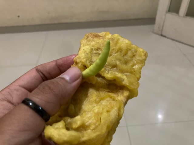 唐辛子をそのまま食べるのって異常だと思われるが、ここは辛いもの大好きインドネシア人の地。みんなこうやって揚げ物に辛味を足してるわけ。まぁ辛さに耐性が無い俺は普段やらないけどね。