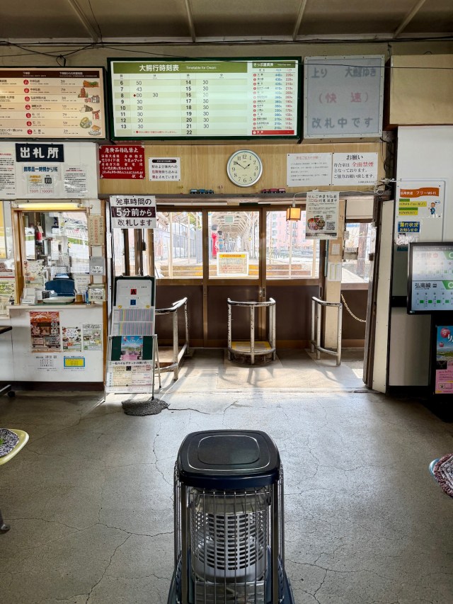 待合室には雪国の象徴・石油ストーブがある。電車が来るギリギリまで冷えた手足を温めることが可能。ちなみに電車は1時間に1本のようだ(平日8時台は2本)。