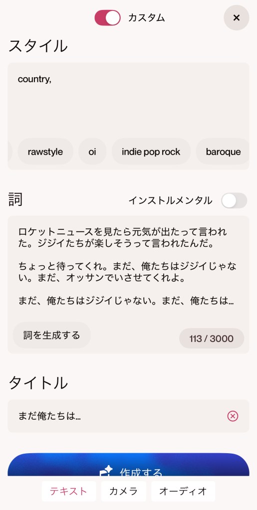 「テキスト」「カメラ」「オーディオ」から「テキスト」を選び、「スタイル(ジャンル)」「詞(歌詞)」「タイトル」を入力する。たとえば、こんな風に。