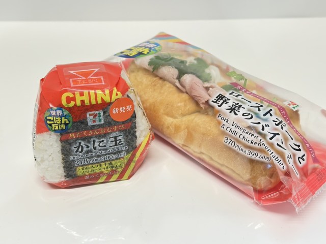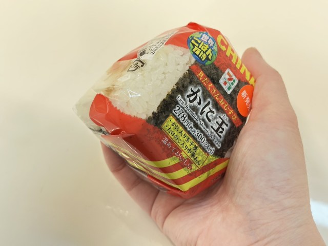 まずは中国から「具だくさんおむすび かに玉」(税抜278円)が出場。具材はその名のとおりカニ玉だ。町中華のイメージもあるが、そもそもカニ玉は広東料理だそう。