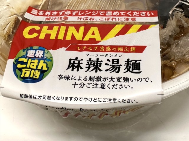 同じく中国の「麻辣湯麺(マーラータンメン)」(税抜598円)は、レンジで温めて食べるヌードル。筆者は自宅でチンしたが、店舗で温めてもよいだろう。
