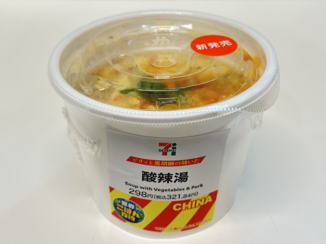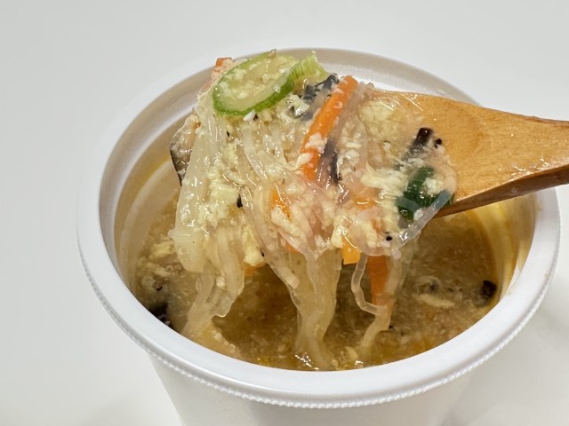 具材は春雨、シイタケ、タケノコ、豆腐、玉子などで、とろみもあるので「食べるスープ」という感じ。酸辣湯そのものが人を選ぶから、好き嫌いは分かれるだろうが、好きな人は好きそう!