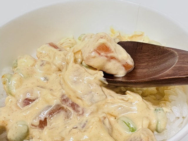 最初に「おかず」部分だけ食べてみたけれど、サーモン&オニオン&マヨネーズなのだから、合わないはずがない。ほんのりスパイシーで、サラダのような味わい。無限に食べられる美味しさだ! しかし、このクリーミーかつサワーなソースが果たして白米に合うのか……