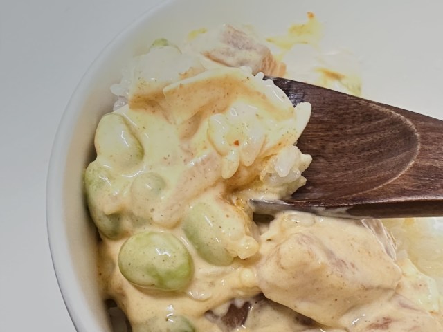 意外にイケる! 最初はサウザンアイランドのドレッシングでご飯を食べているような違和感があったけれど、考えてみれば我々は酢飯にエビとマヨネーズとアボカドをのせて食べる国民だ。スパイシーマヨだってご飯と一緒に食べられるのだ。
