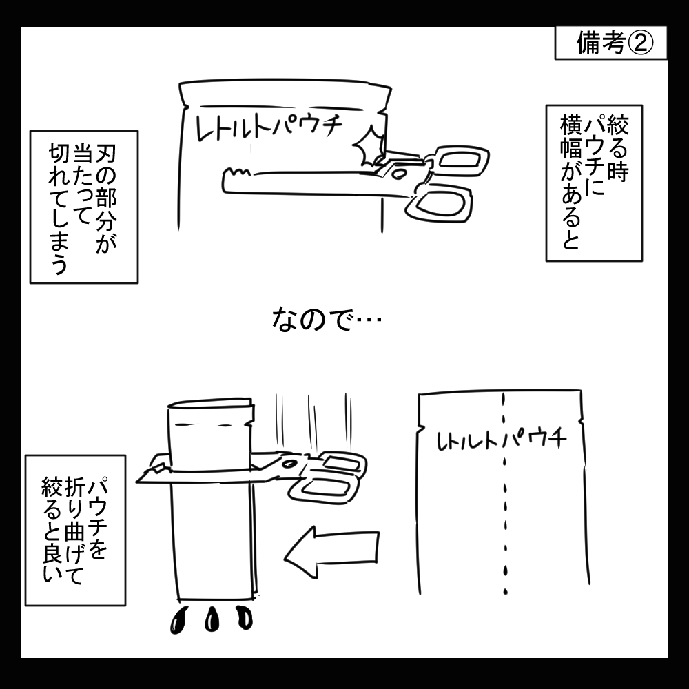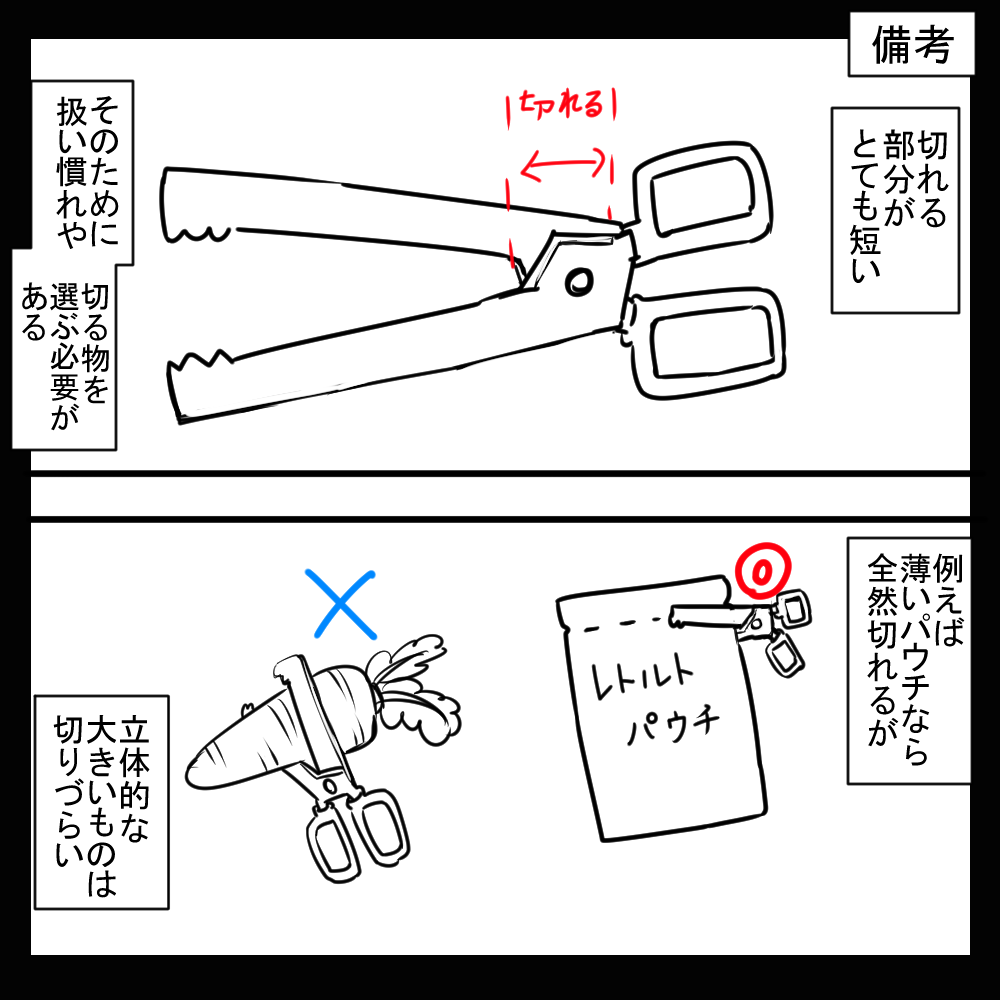 用途としてはやはりレトルトパウチに使うことが断然オススメ。特に「絞る」ことにおいてはなかなかの優れもの。レトルトパウチの食品をお召し上がりの際はぜひご活用頂きたい一品である。
