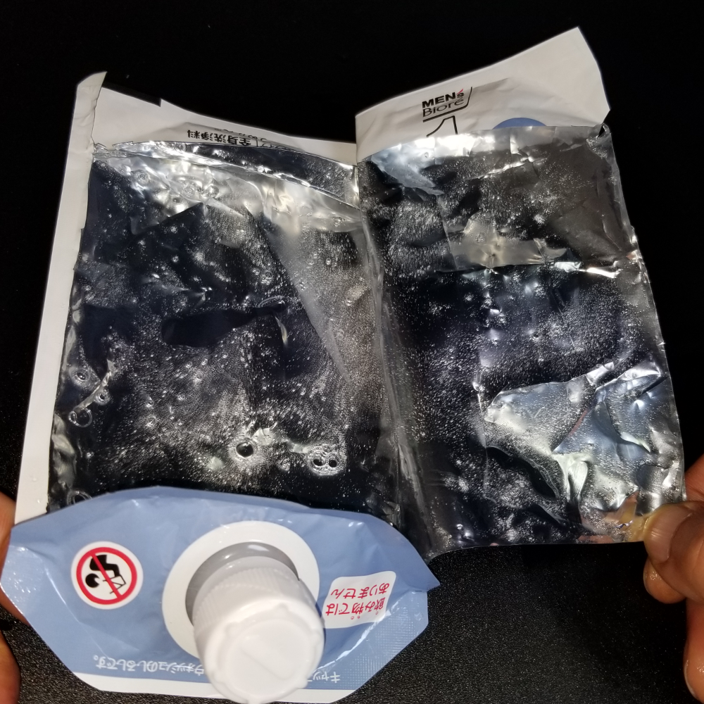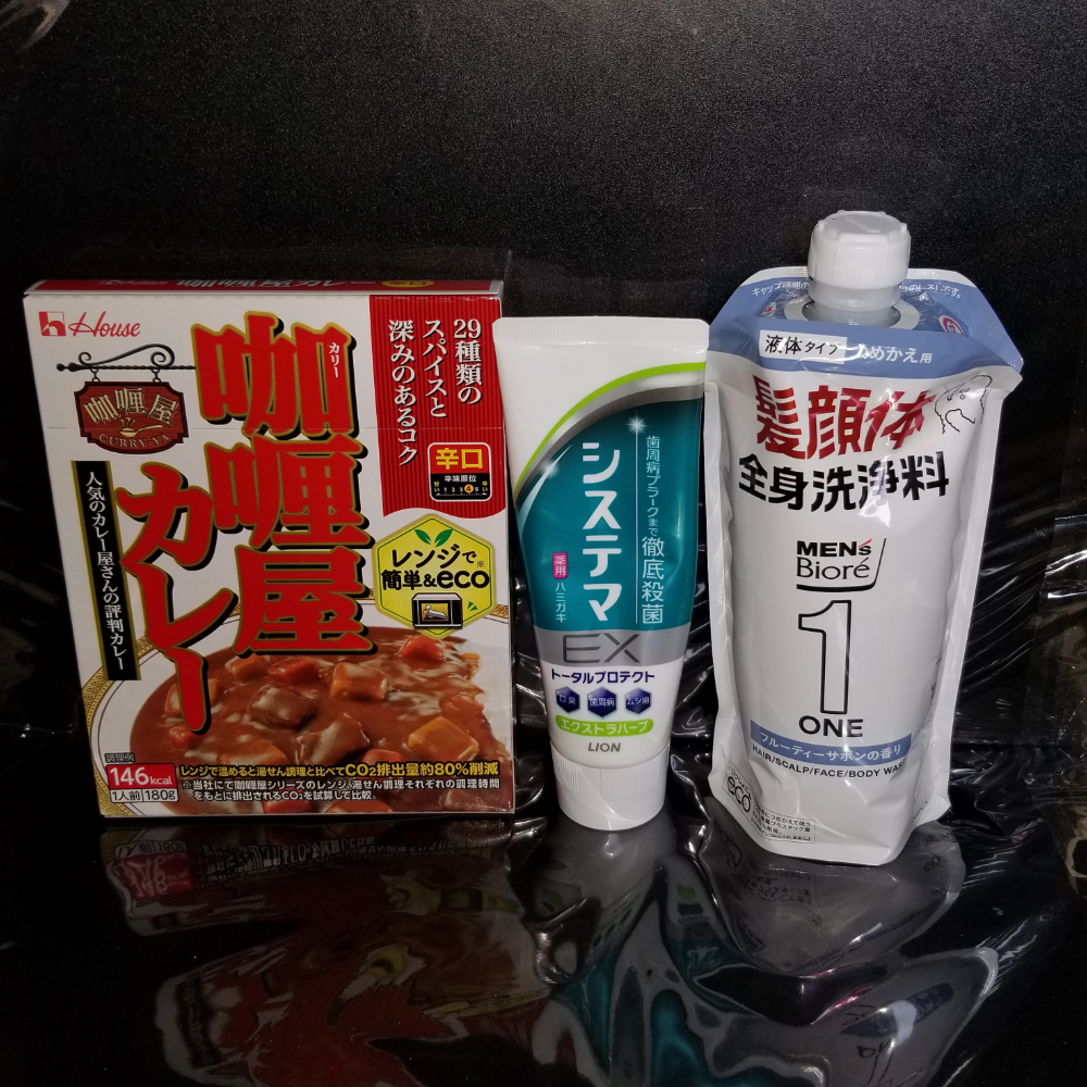 用意した物は上の写真の3点。ちなみにカレーのレトルトパウチ・詰め替え用シャンプー・歯磨き粉の順番で、中に入っている液体の粘度は高く、外装のパッケージが厚く丈夫な物となっている。