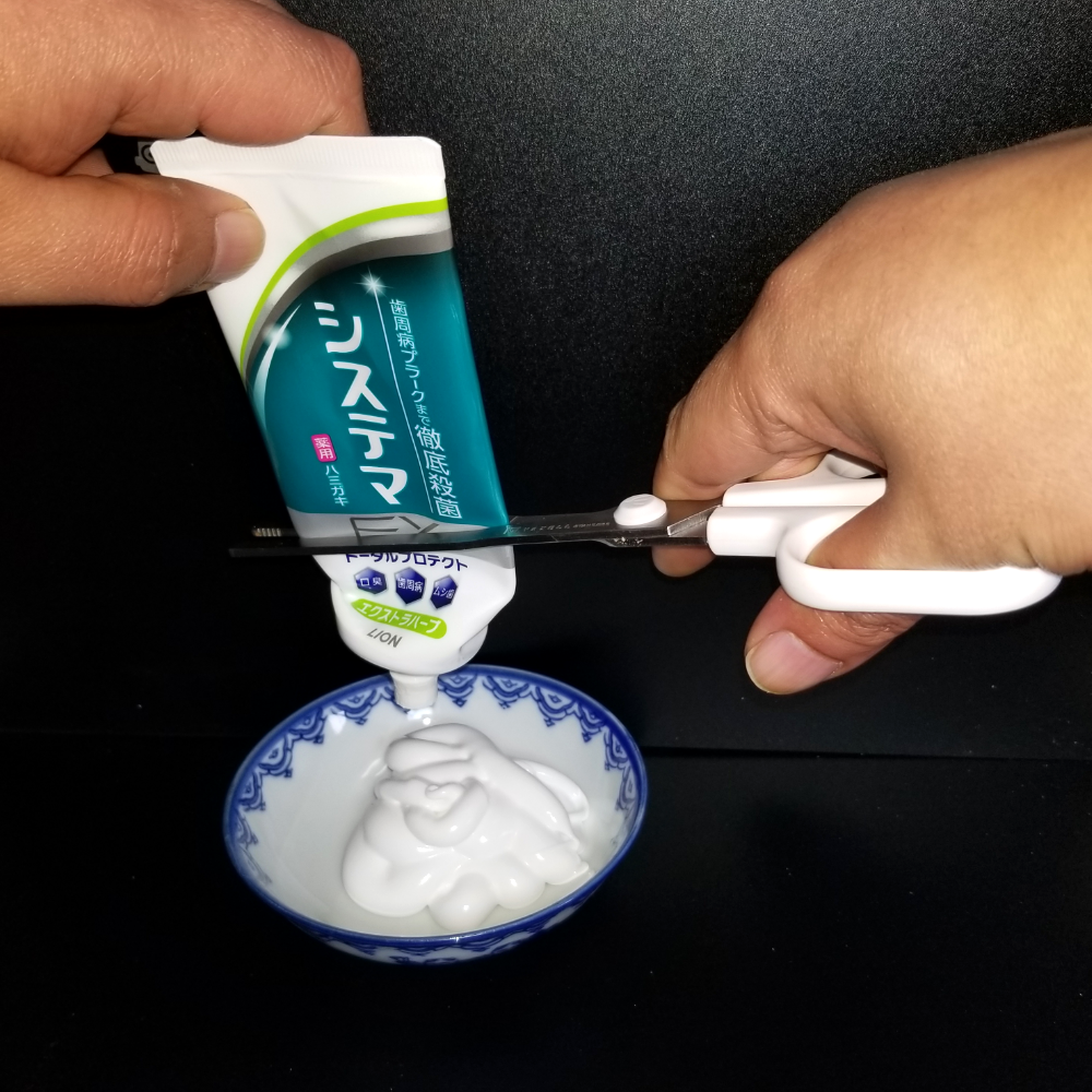 歯磨き粉の場合、外装が丈夫なので絞るのにも結構力を入れた……。しかしあくまでコレはレトルトパウチに特化したハサミ。パウチ以上にぶ厚い外装だと簡単には絞れないのもまた然りではないだろうか。