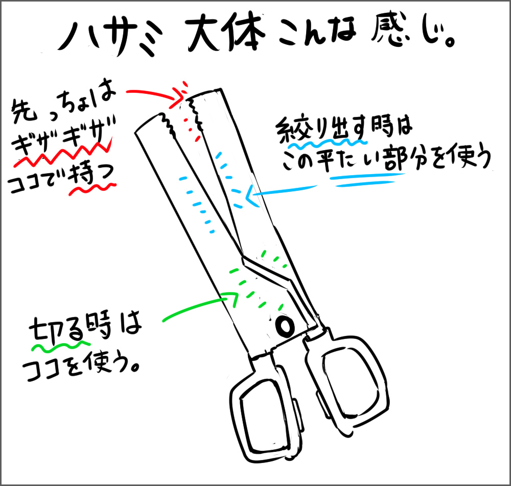 最後のここが真骨頂。はさみの中間部でパウチを挟んで絞り出せる。
