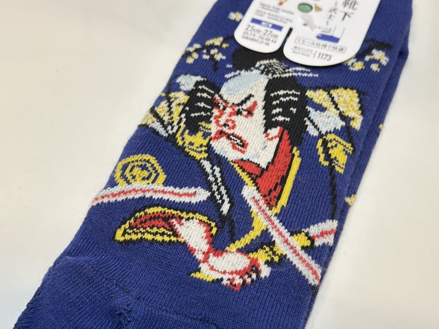 特筆すべきは、豊富なカラー&デザインのラインナップ。写真はメンズの「武士」デザイン。正確には武士を演じる歌舞伎役者を描いた浮世絵をデザイン、という感じかな? ほかにも富士山や風神雷神など、役者絵に負けず劣らず日本らしいモチーフが並んでいた。