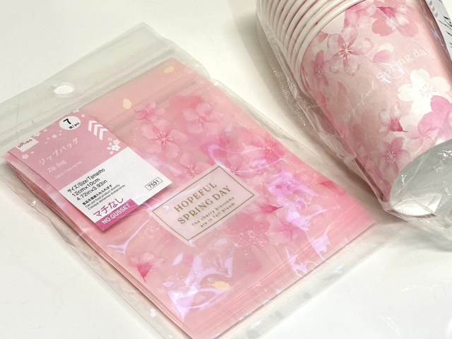 お花見シーズンのいまだからこそ、店頭にずらりと並んでいる桜モチーフの雑貨。紙皿や紙コップといった行楽アイテムのほか、文房具、シール、ラッピング用品など多彩なアイテムが一挙に展開されている。