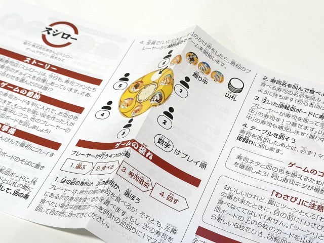 「遊び方」ペーパーは日本語オンリーなのだけれど、公式YouTubeチャンネルの解説動画を英語字幕で観るなどの対処は可能。ゲームとして遊ばなくても、ずらりと並んだ寿司カードが楽しいアイテムだ。