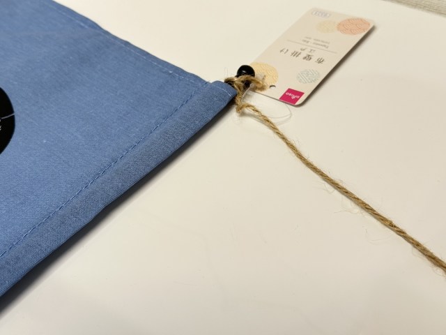 のれんのようにポールが通っていて、麻紐で壁に掛けられる。紐が少し弱そうなので、DIYで付け替えてもいいかも。絵柄のサイズはA4より少し大きいくらい。