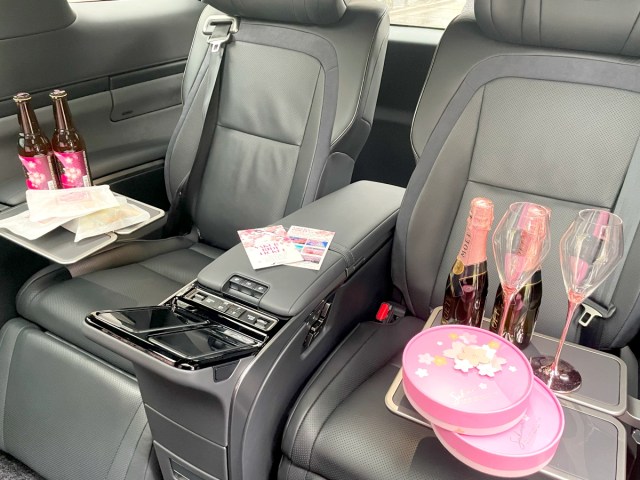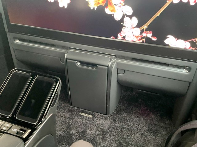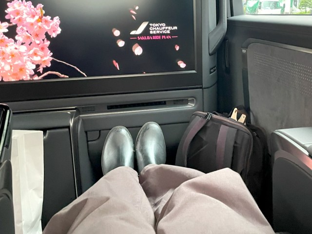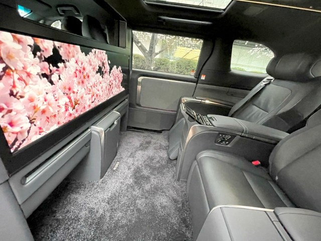 まずは座席の前に設置された巨大すぎるモニターに悶絶。美しいデジタル桜が常時映し出されており、非日常感がとにかく尋常ではない。何なんだよこの車……!