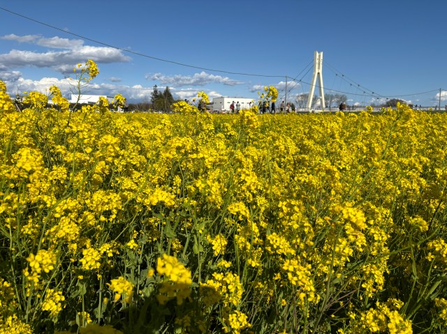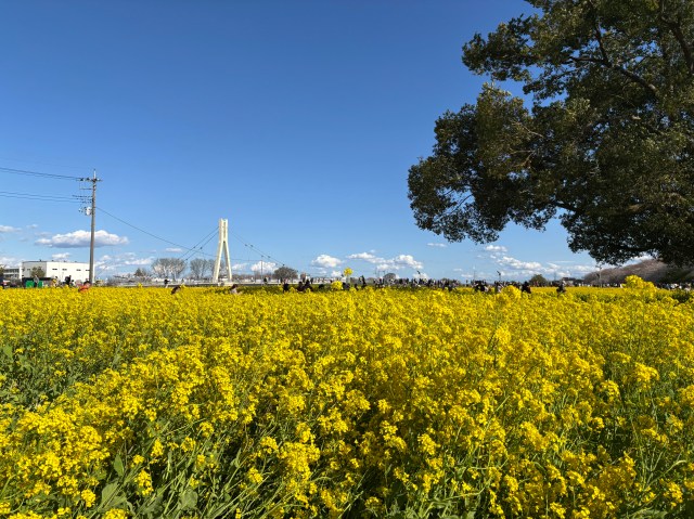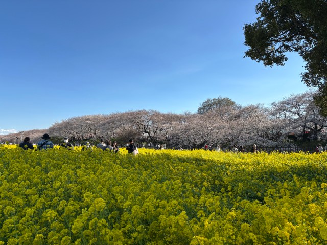 マップに投稿された写真を見ると、満開の桜並木の下に菜の花畑が広がっている! こんな幻想的な風景、絵本の世界でしか見たことない! 映画のロケ地などにもなってるそうな。
