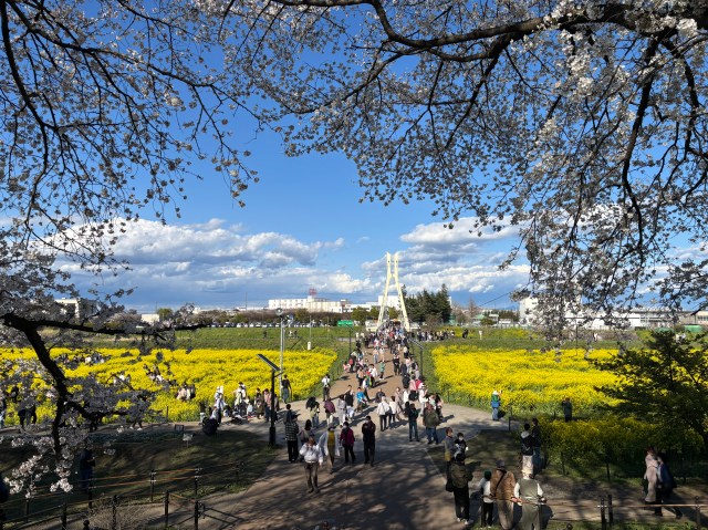桜のピンク、菜の花の黄色、眩しい青空と芝生の緑、川の青。自然のパレットにうっとりするような景色である。